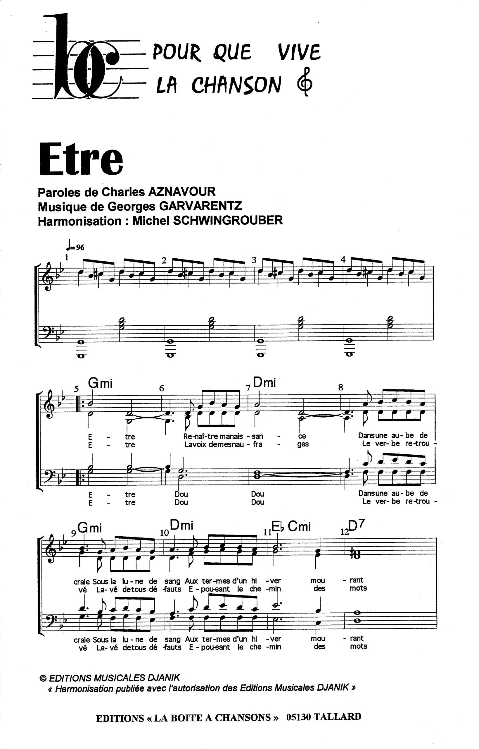 Paroles et musique de AZNAVOUR/GARVARENTZ Harmonisation : Michel SCHWINGROUBER