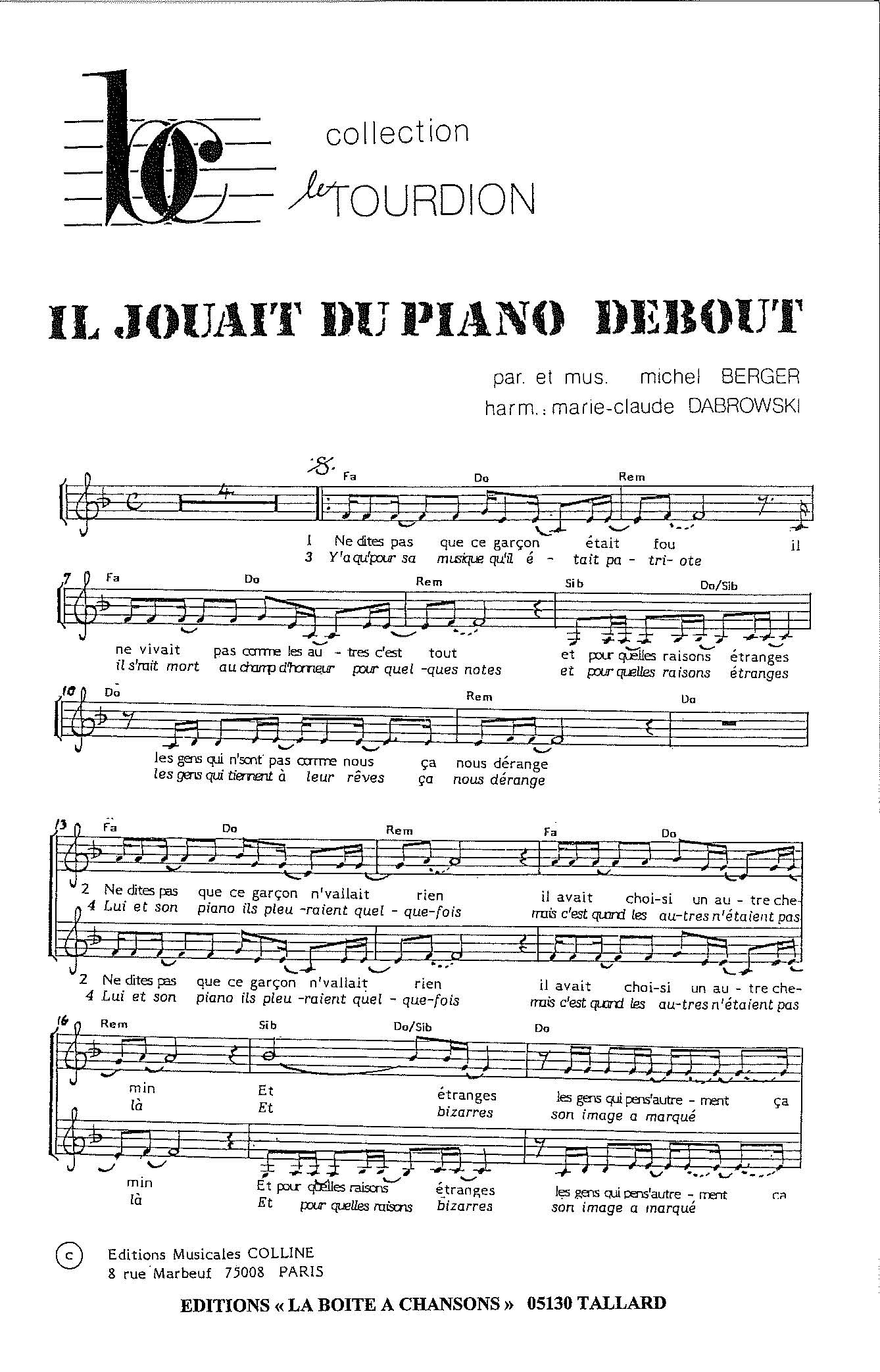 Paroles et musique de BERGER Harmonisation : Dabrorwski