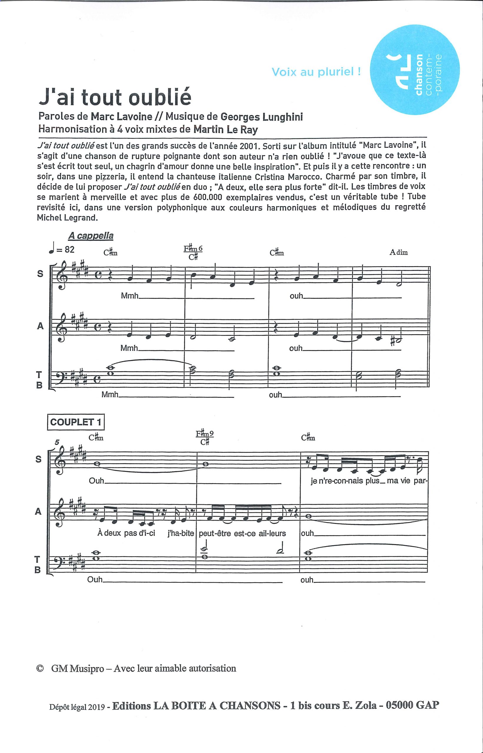 Paroles et musique : M. Lavoine / G. Lunghini Harmonisation : Martin Le Ray