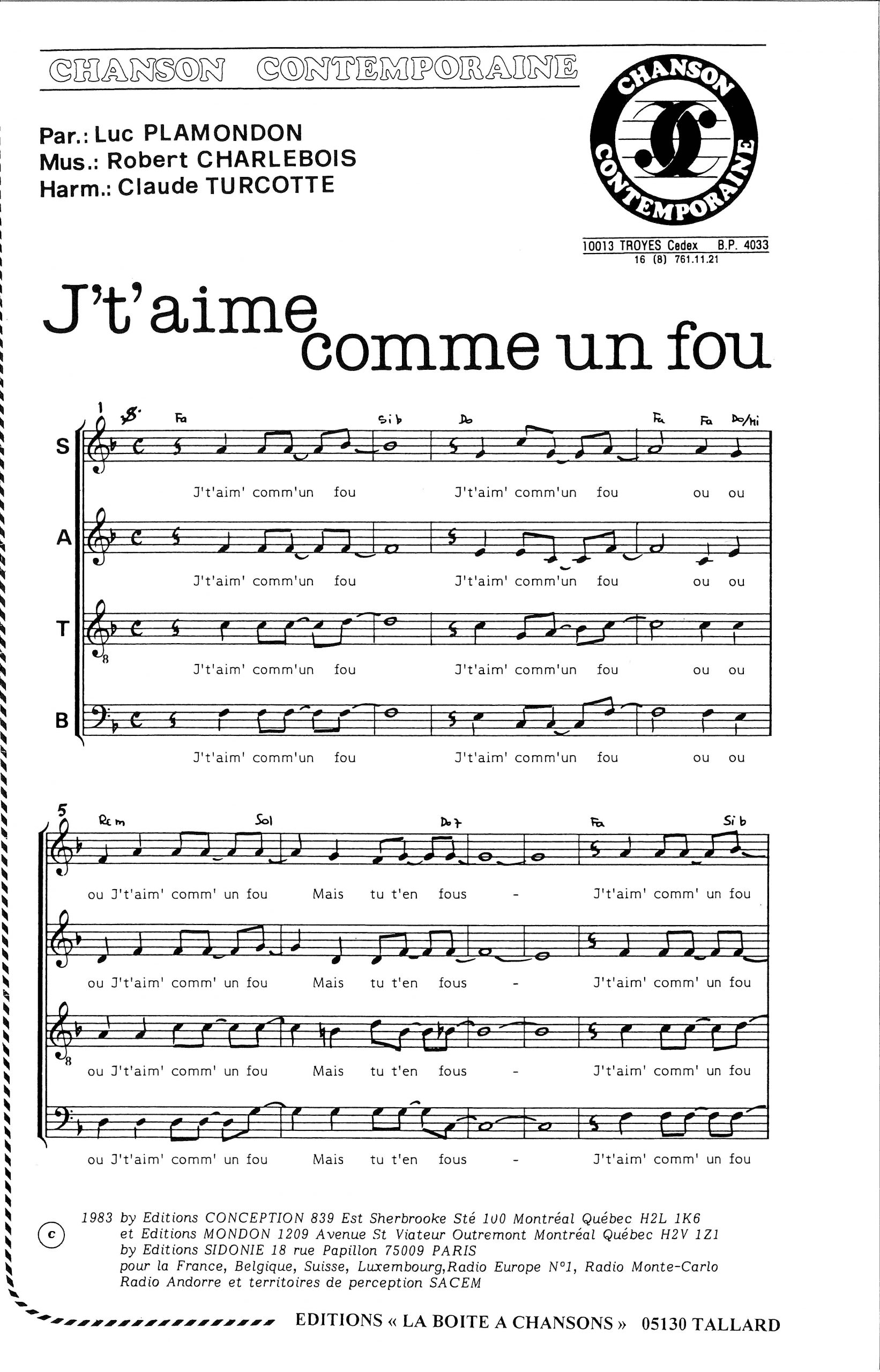 Paroles et musique de PLAMONDON/CHARLEBOIS Harmonisation : Claude TURCOTTE