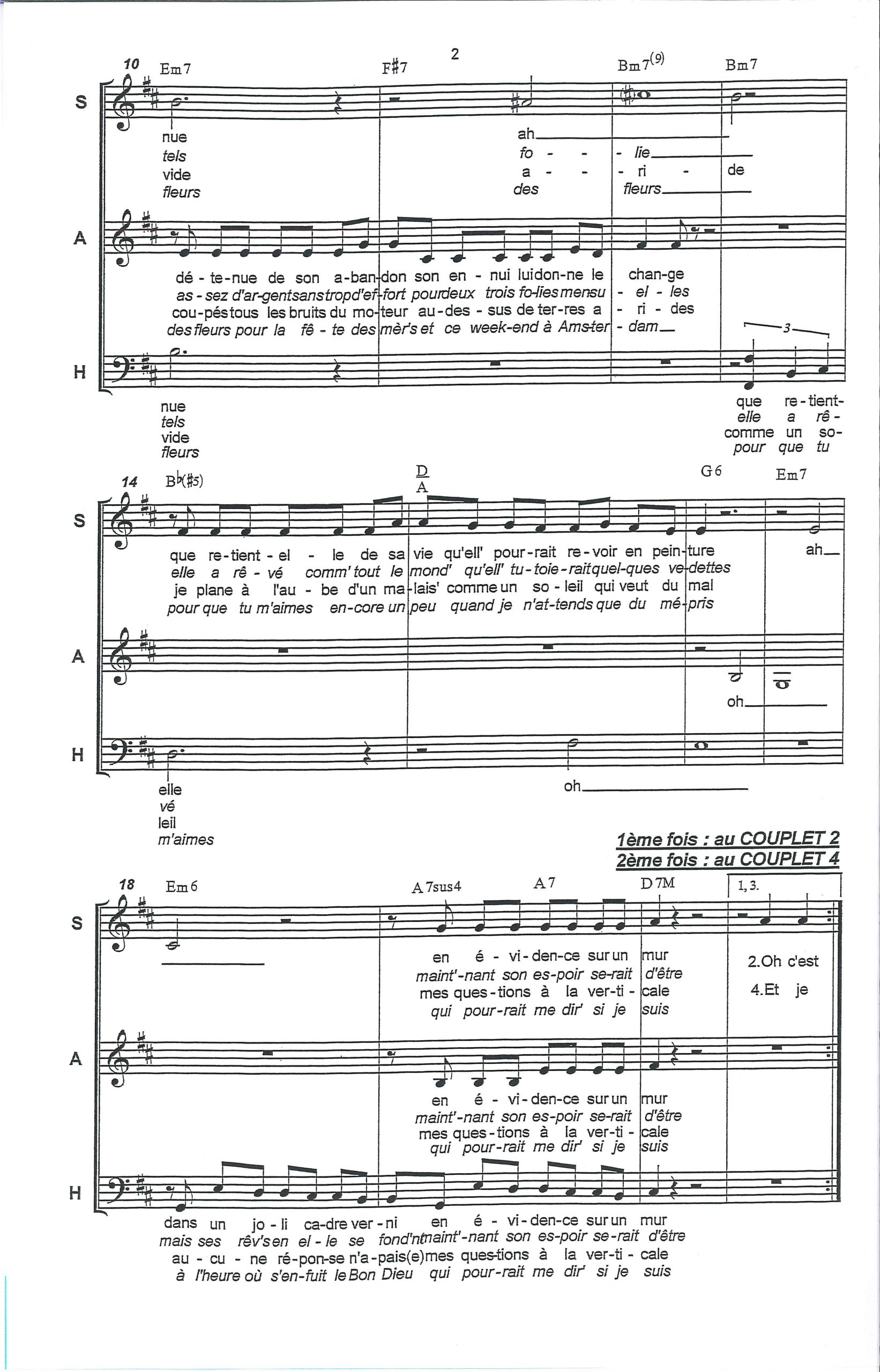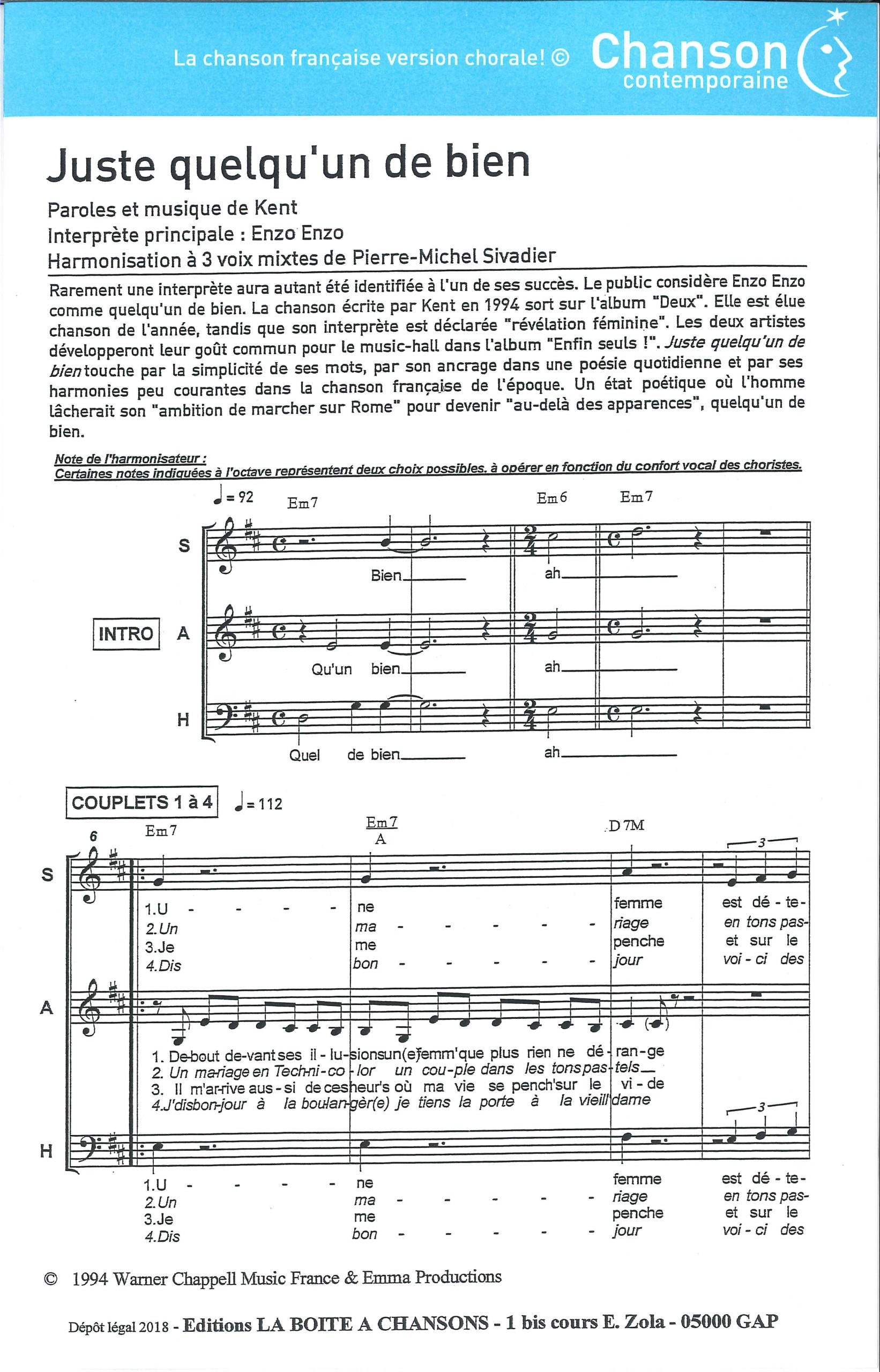 Paroles et musique : Kent Harmonisation : Pierre Michel Sivadier