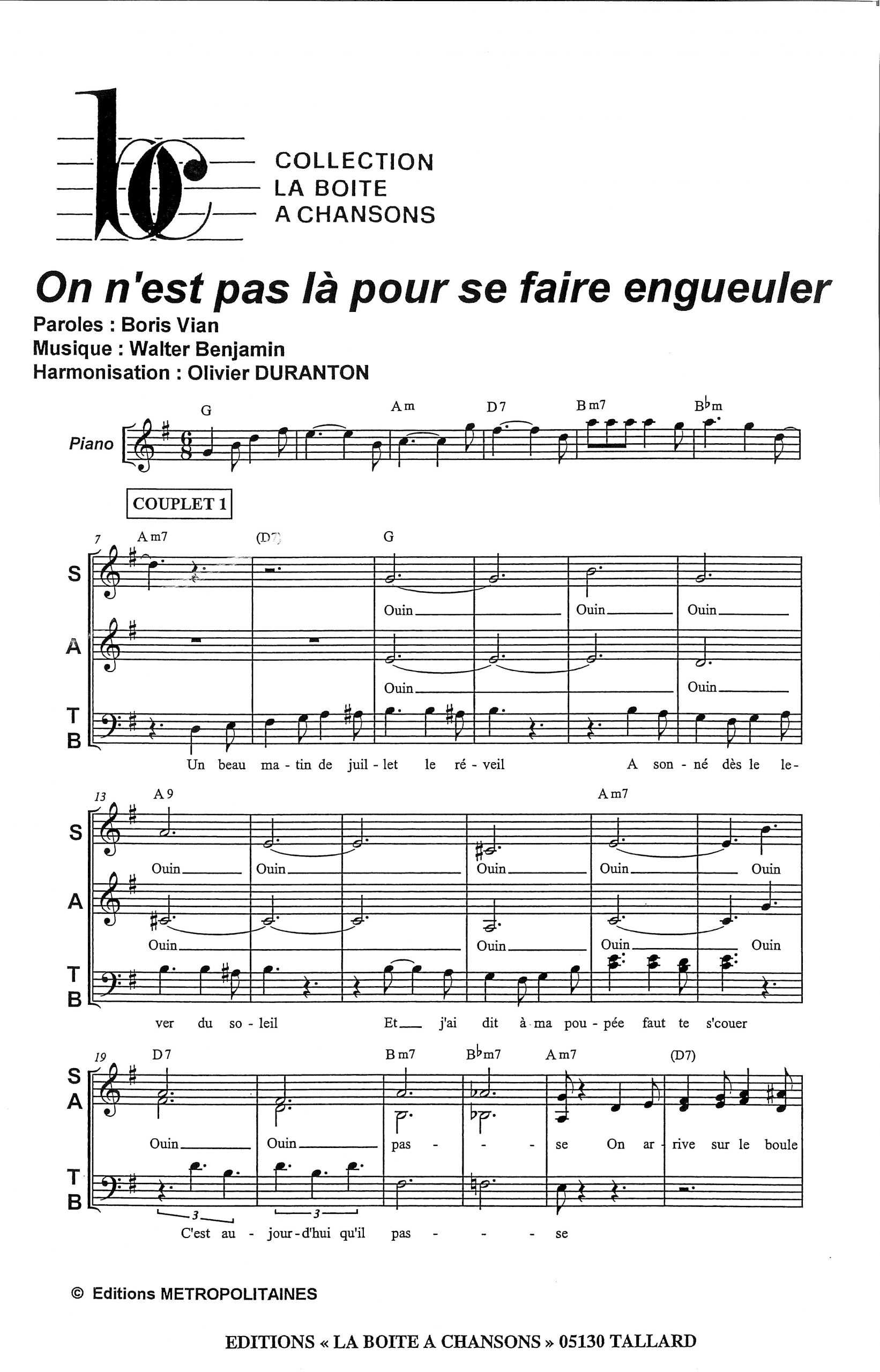 Paroles et musique de VIAN/WALTER Harmonisation : Olivier DURANTON