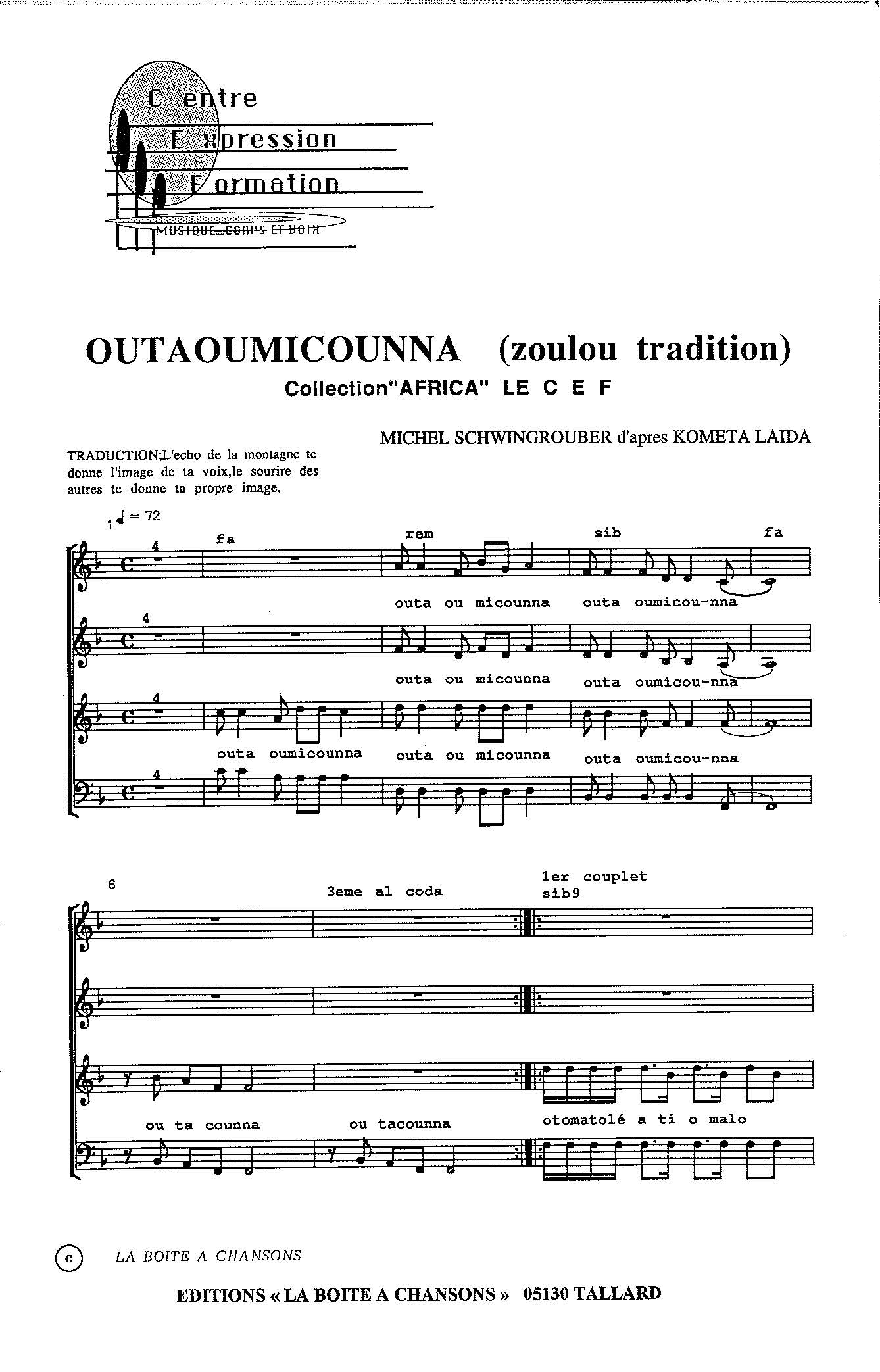 Paroles et musique de SCHWINGROUBER Harmonisation : Michel SCHWINGROUBER