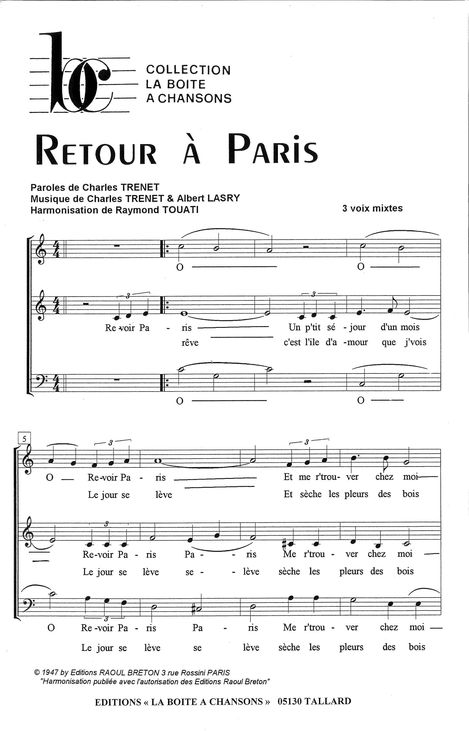 Paroles et musique de TRENET/LASRY Harmonisation : Raymond TOUATI