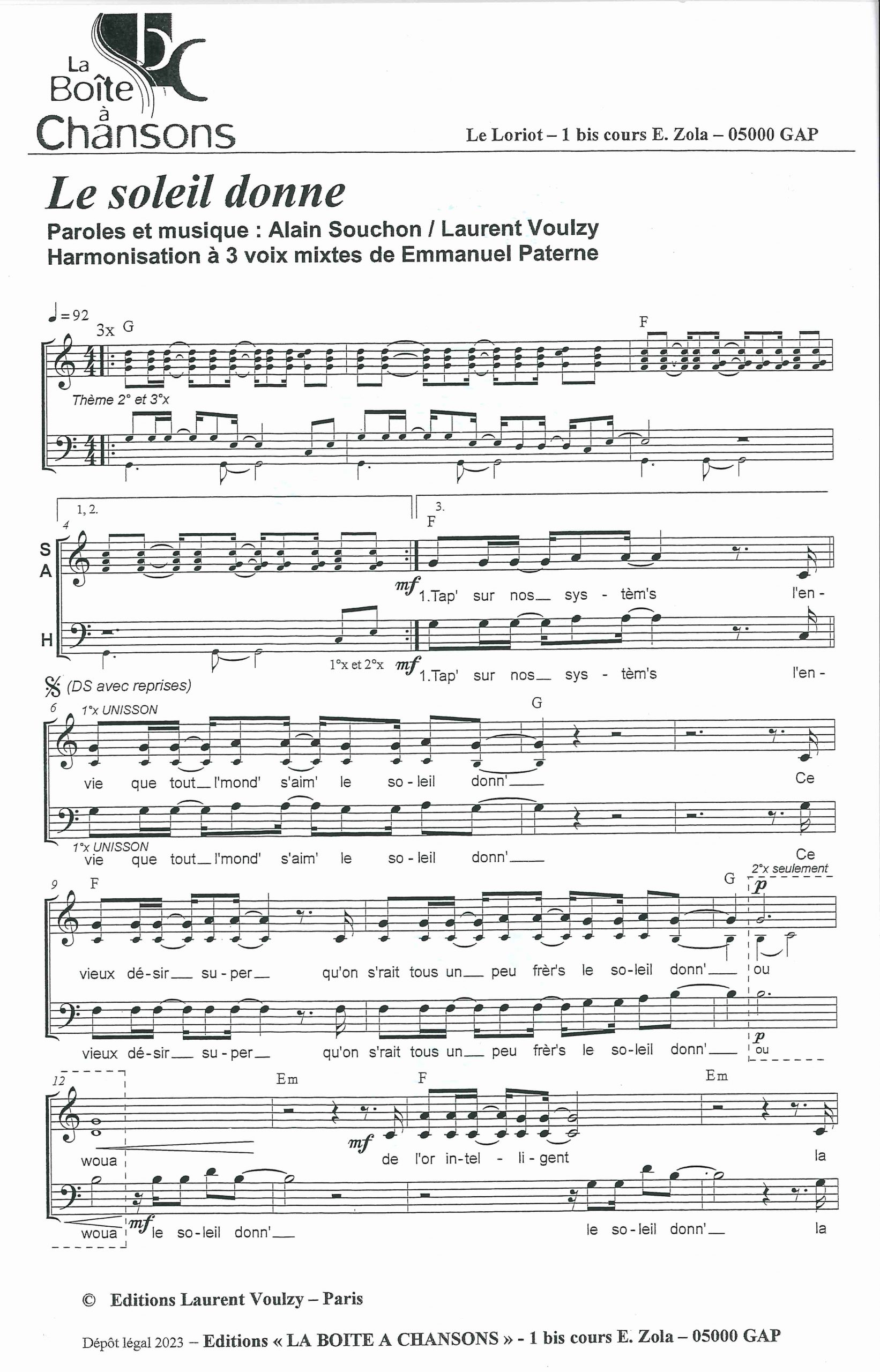 Paroles et musique : A. Souchon / L. Voulzy Harmonisation : Emmanuel Paterne