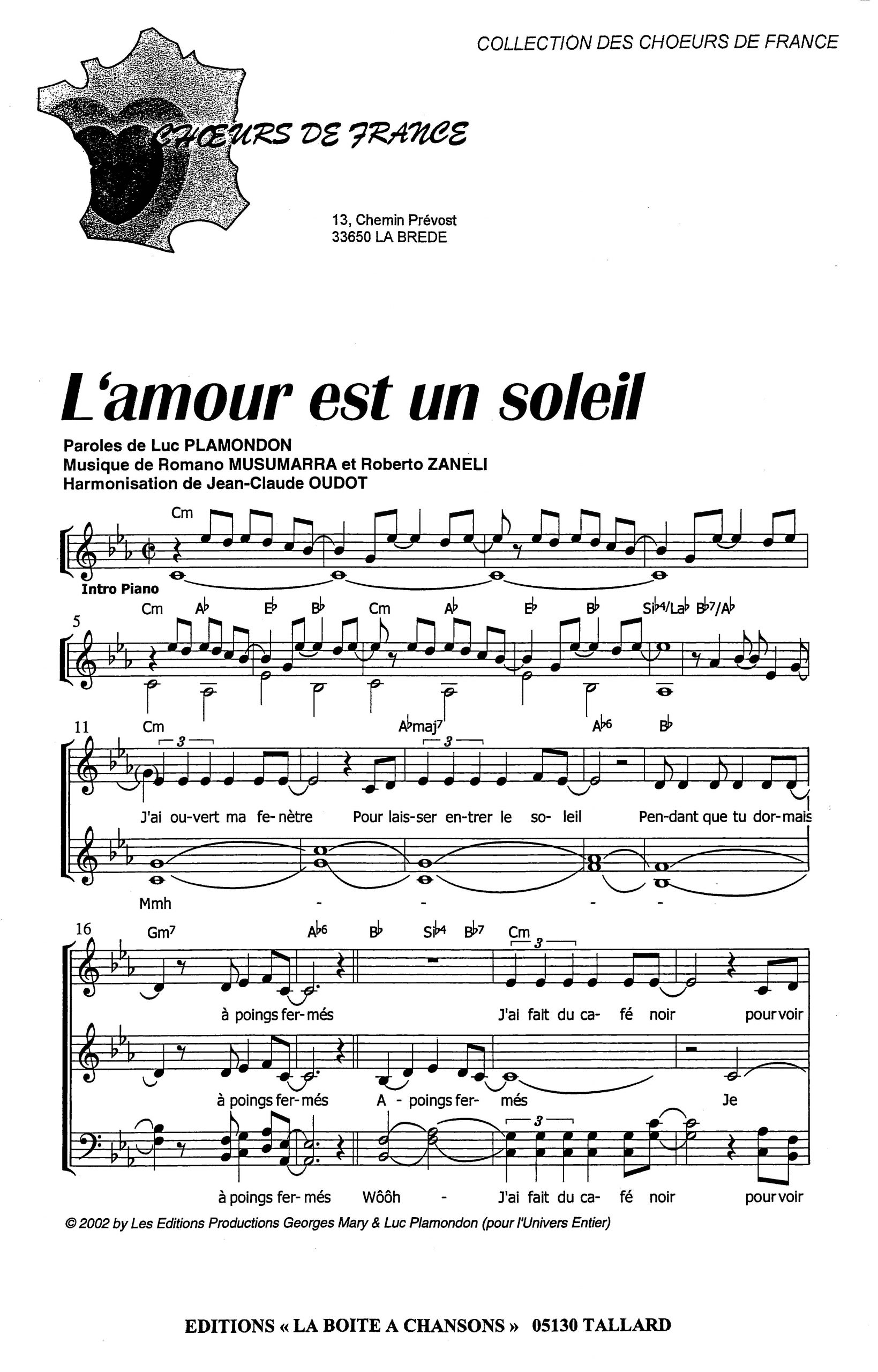 Paroles et musique de PLAMONDON/MUSUMARRA Harmonisation : Jean Claude OUDOT