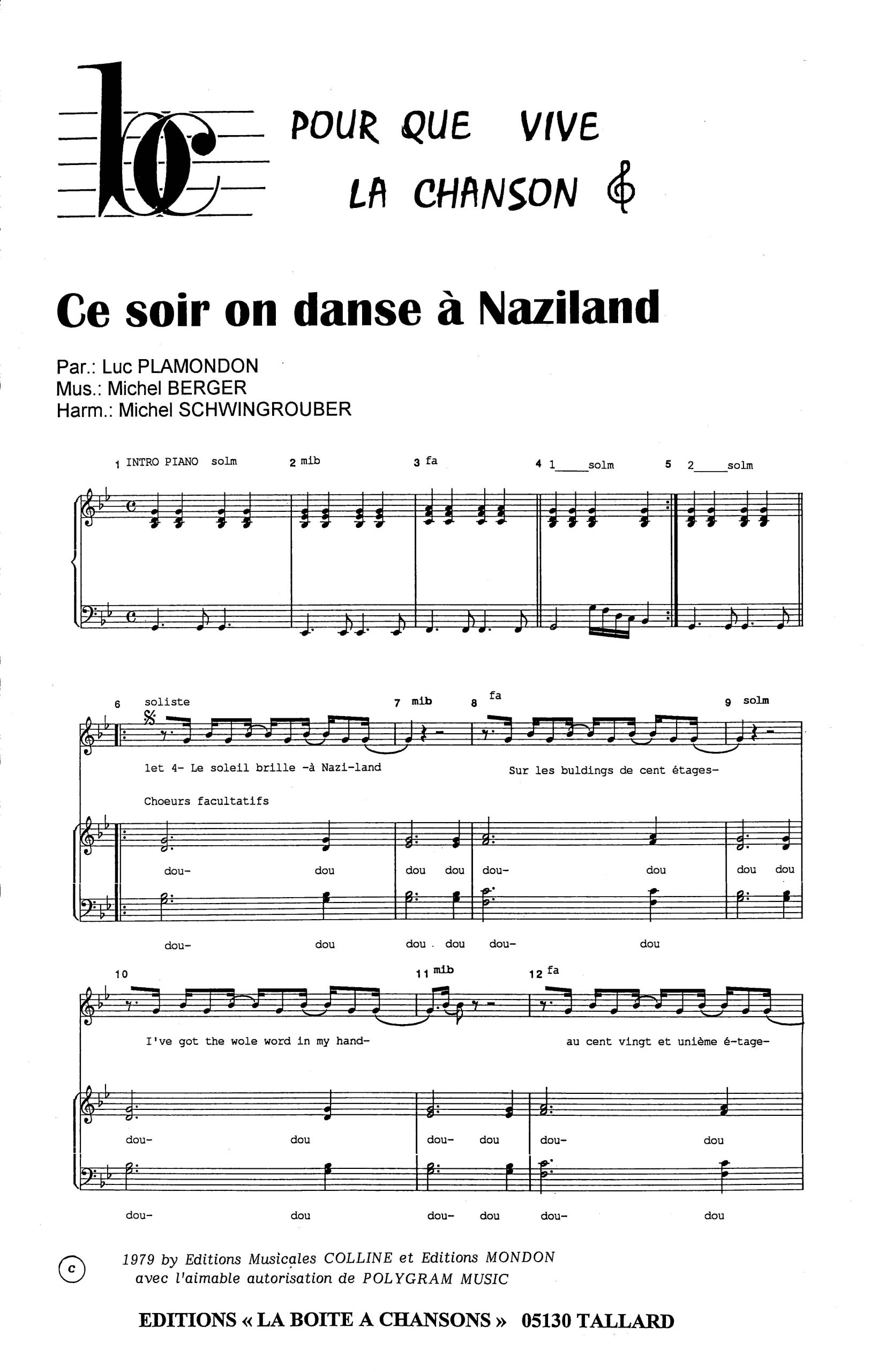 Paroles et musique de PLAMONDON/BERGER Harmonisation : Michel SCHWINGROUBER