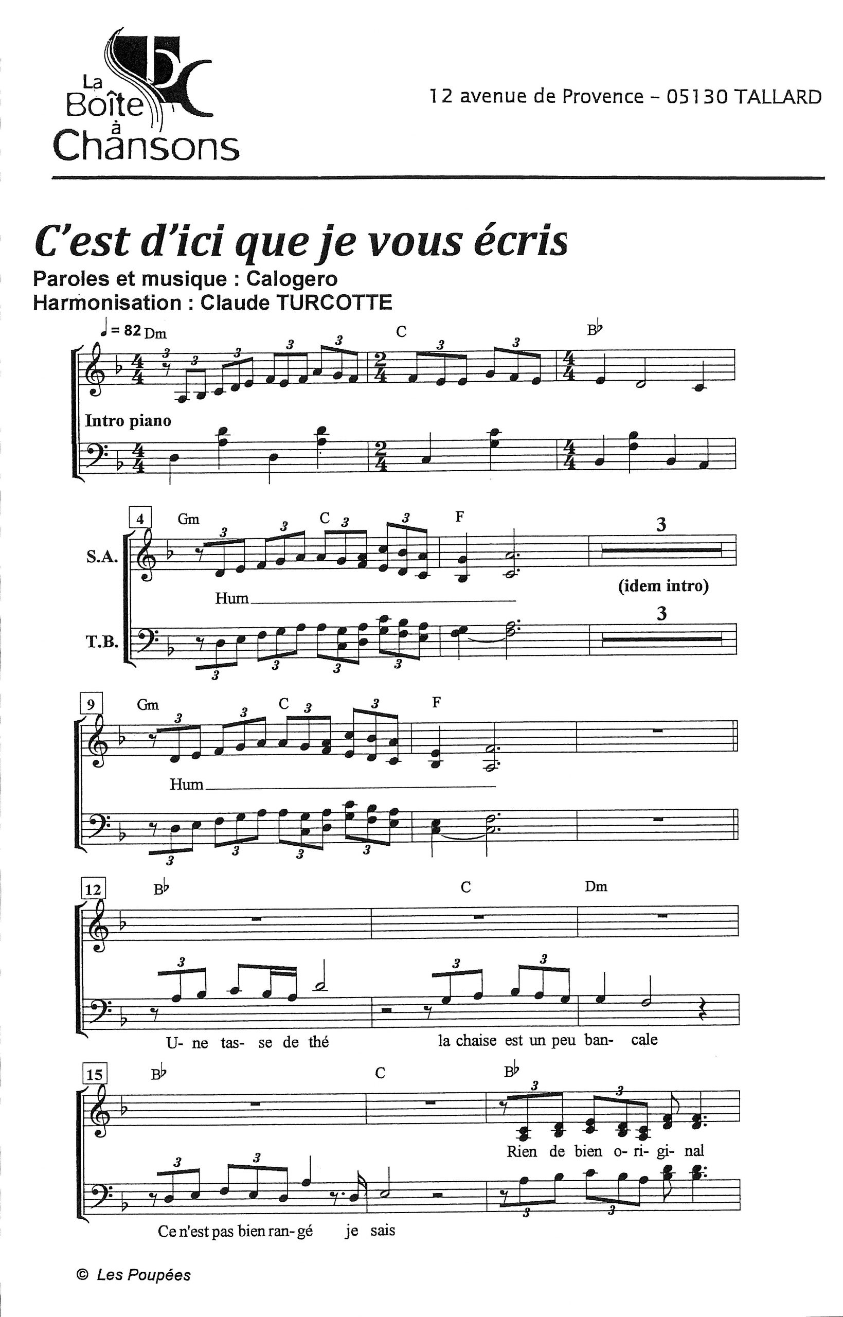 Paroles et musique de CALOGERO Harmonisation : Claude TURCOTTE