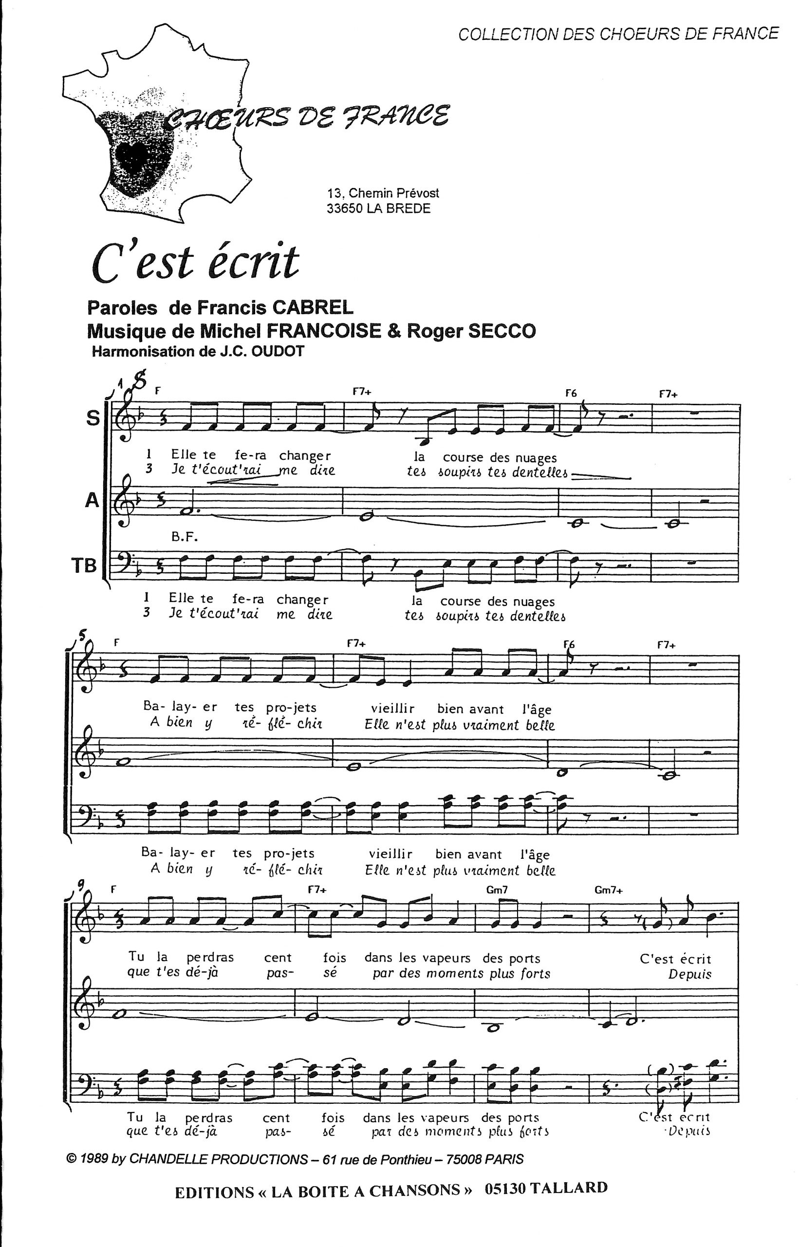 Paroles et musique de CABREL Harmonisation : Jean Claude OUDOT