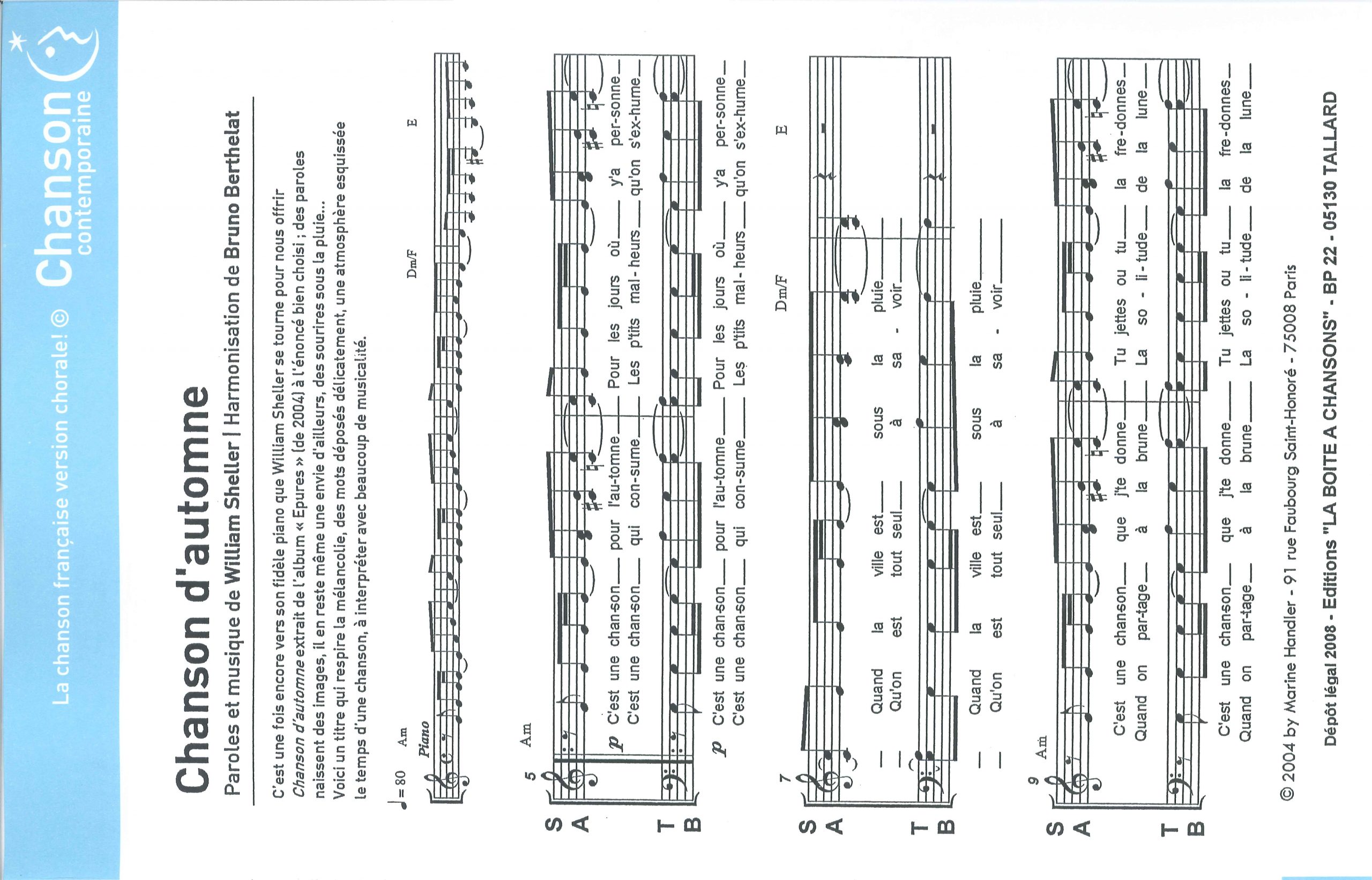 Paroles et musique de SHELLER Harmonisation : Bruno BERTHELAT