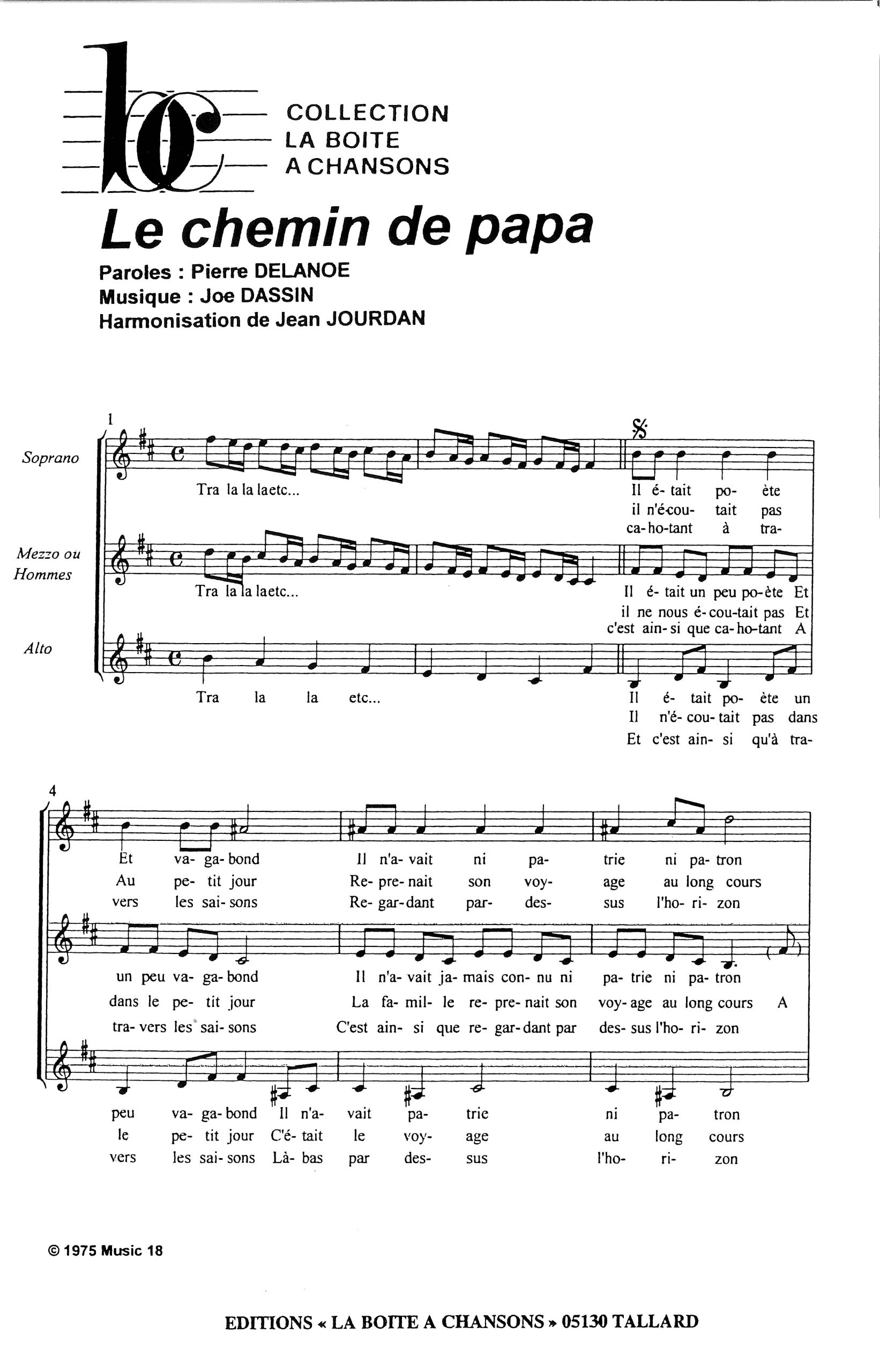 Paroles et musique de DELANOE/DASSIN Harmonisation : Jean JOURDAN