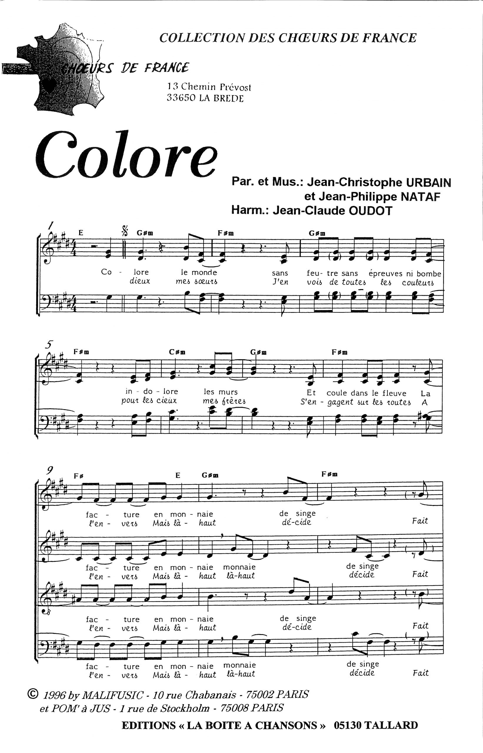 Paroles et musique de NATAF/URBAIN Harmonisation : Jean Claude OUDOT