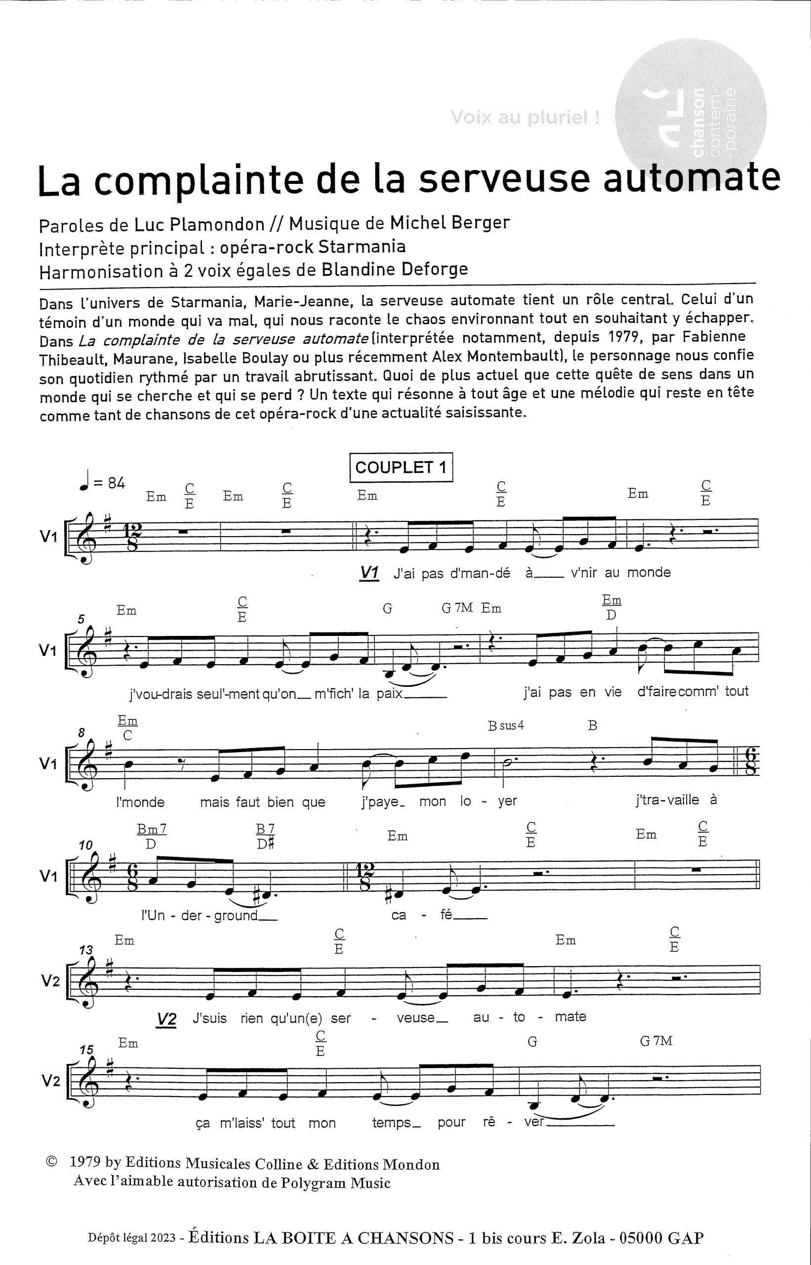 Paroles et musique : Plamondon / Berger Harmonisation : Blandine Deforge