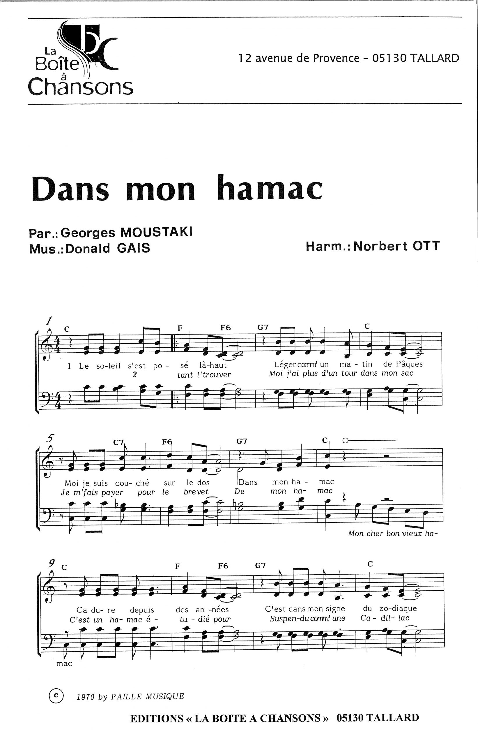 Paroles et musique de MOUSTAKI Harmonisation : Norbert OTT