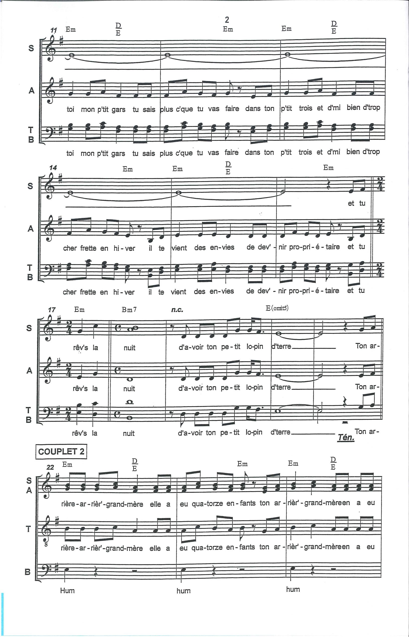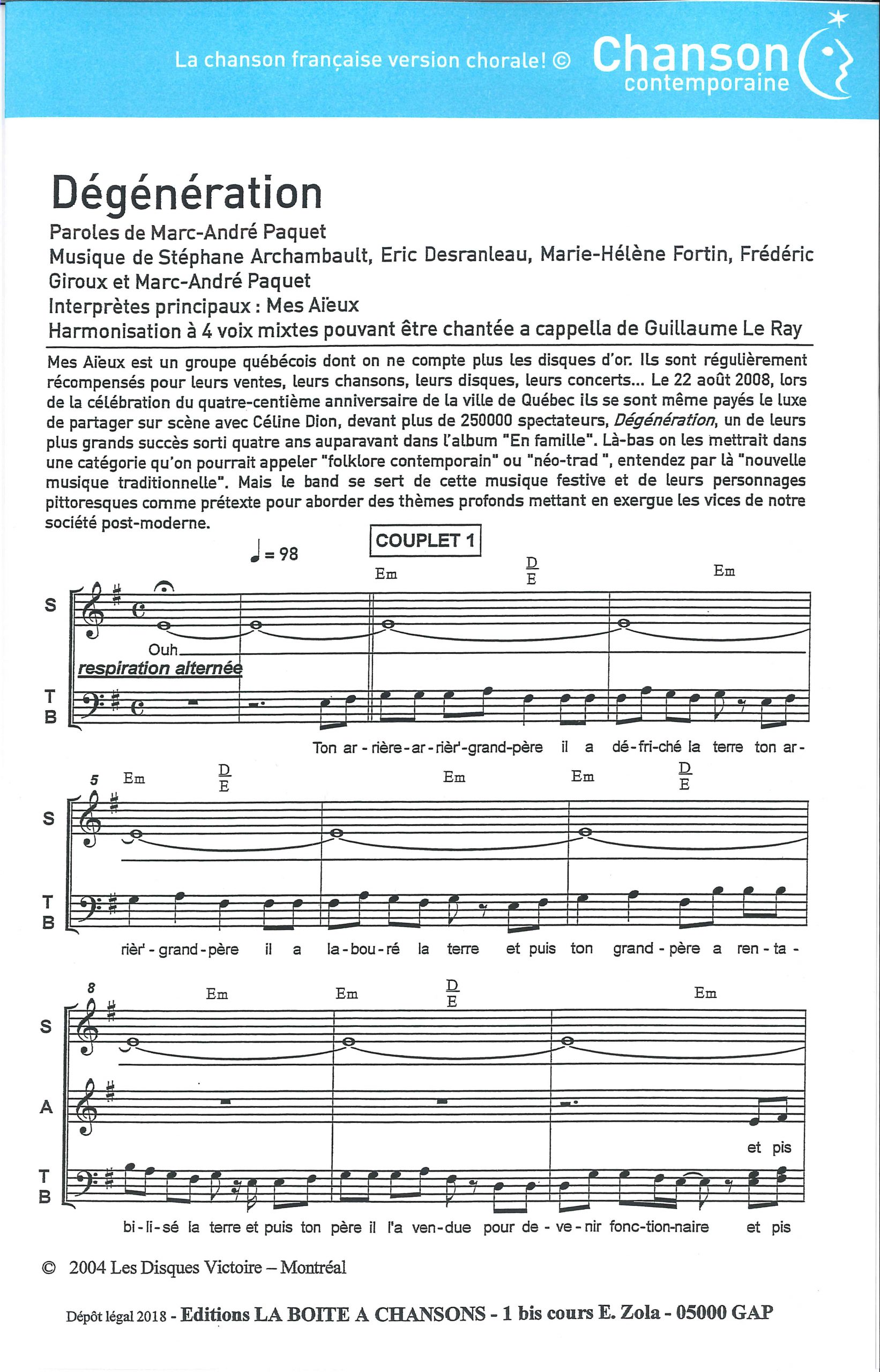 Paroles et musique : M.A. Paquet / S. Archambault / E. Desranleau / M.H. Fortin / F. Giroux Harmonisation : Guillaume Le Ray