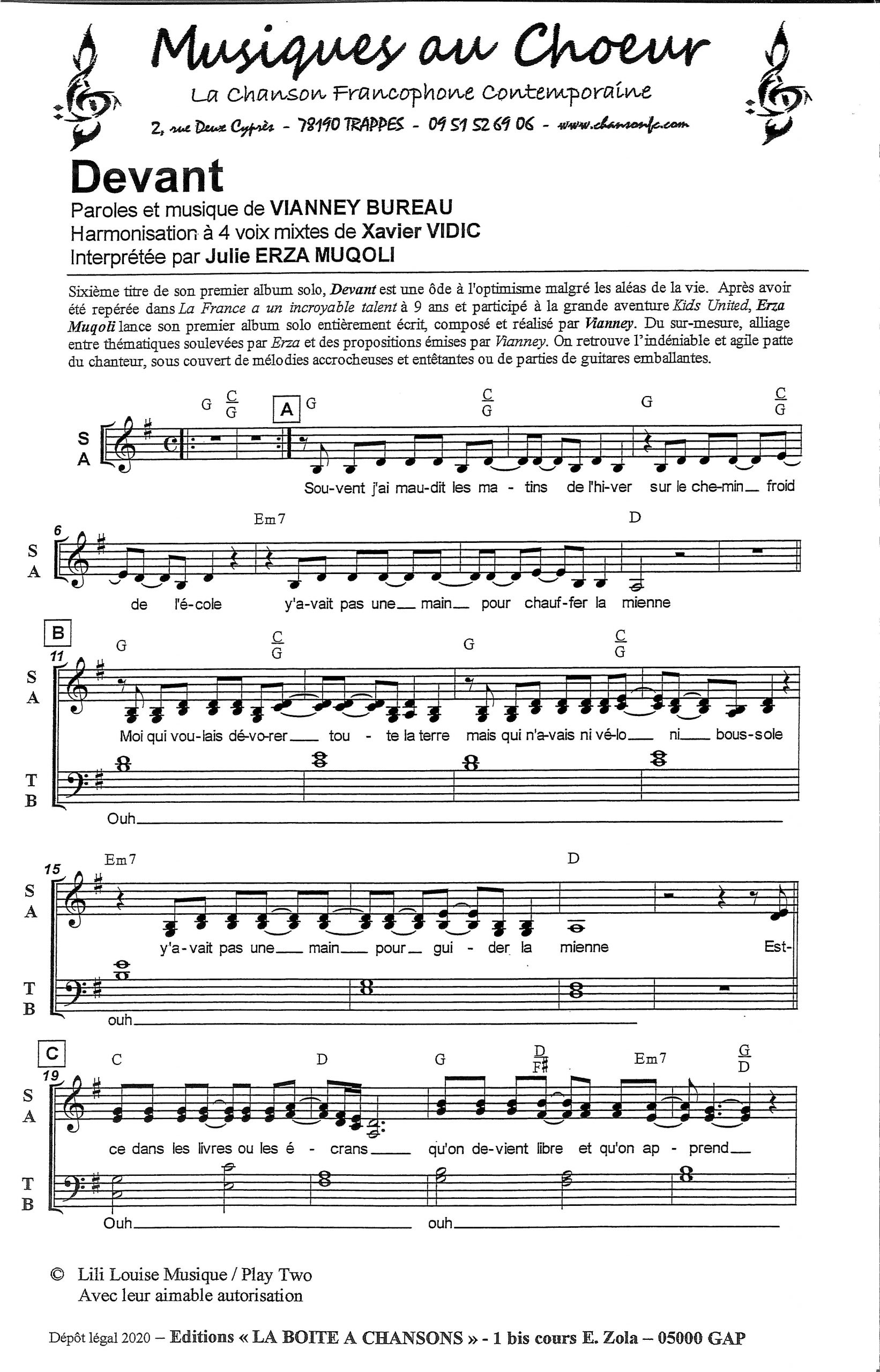 Paroles et musique : V. Bureau Harmonisation : Xavier Vidic