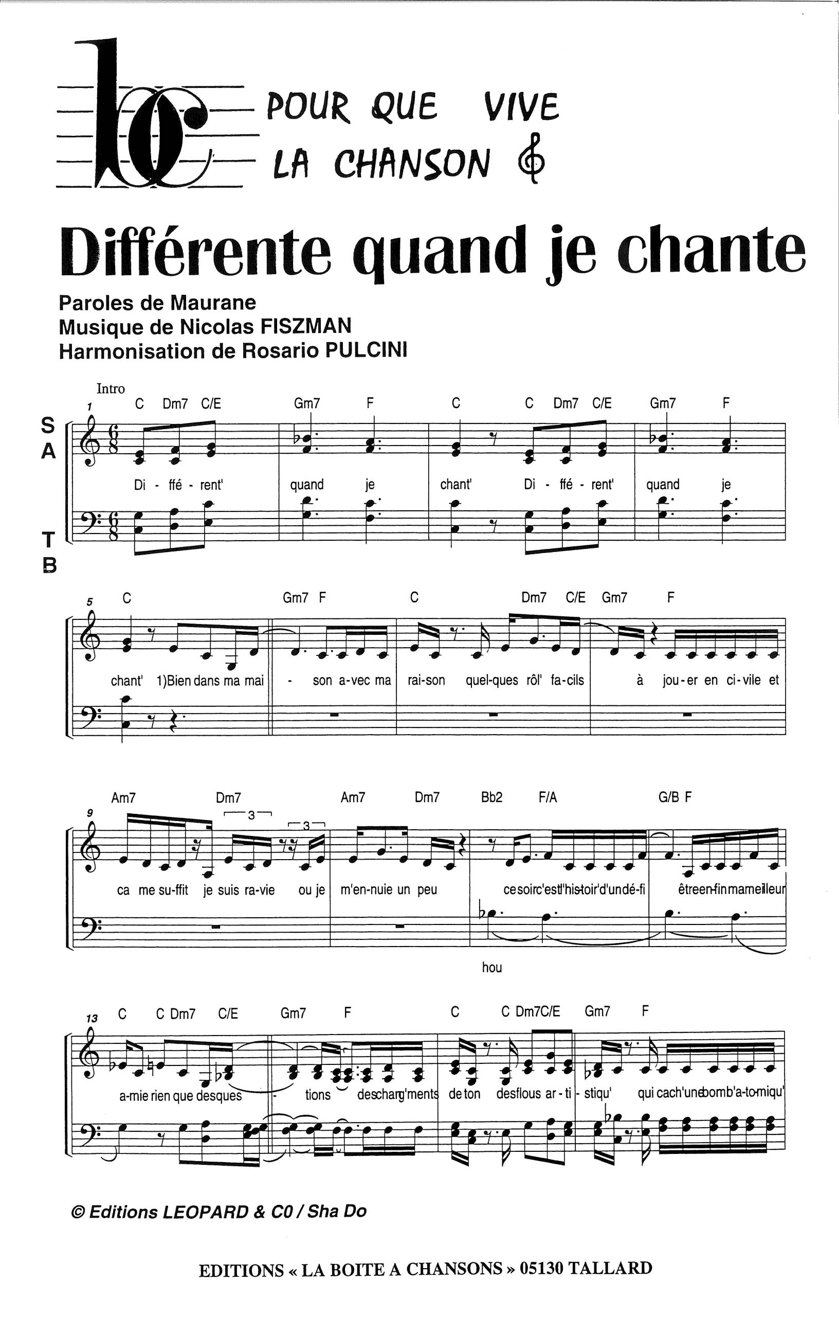 Paroles et musique de MAURANE/NICOLAS Harmonisation : Rosario PULCINI