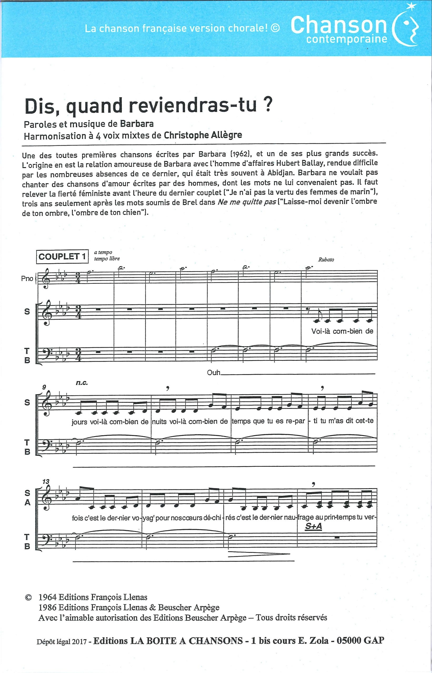 Paroles et musique : Barbara Harmonisation : Christophe ALLEGRE