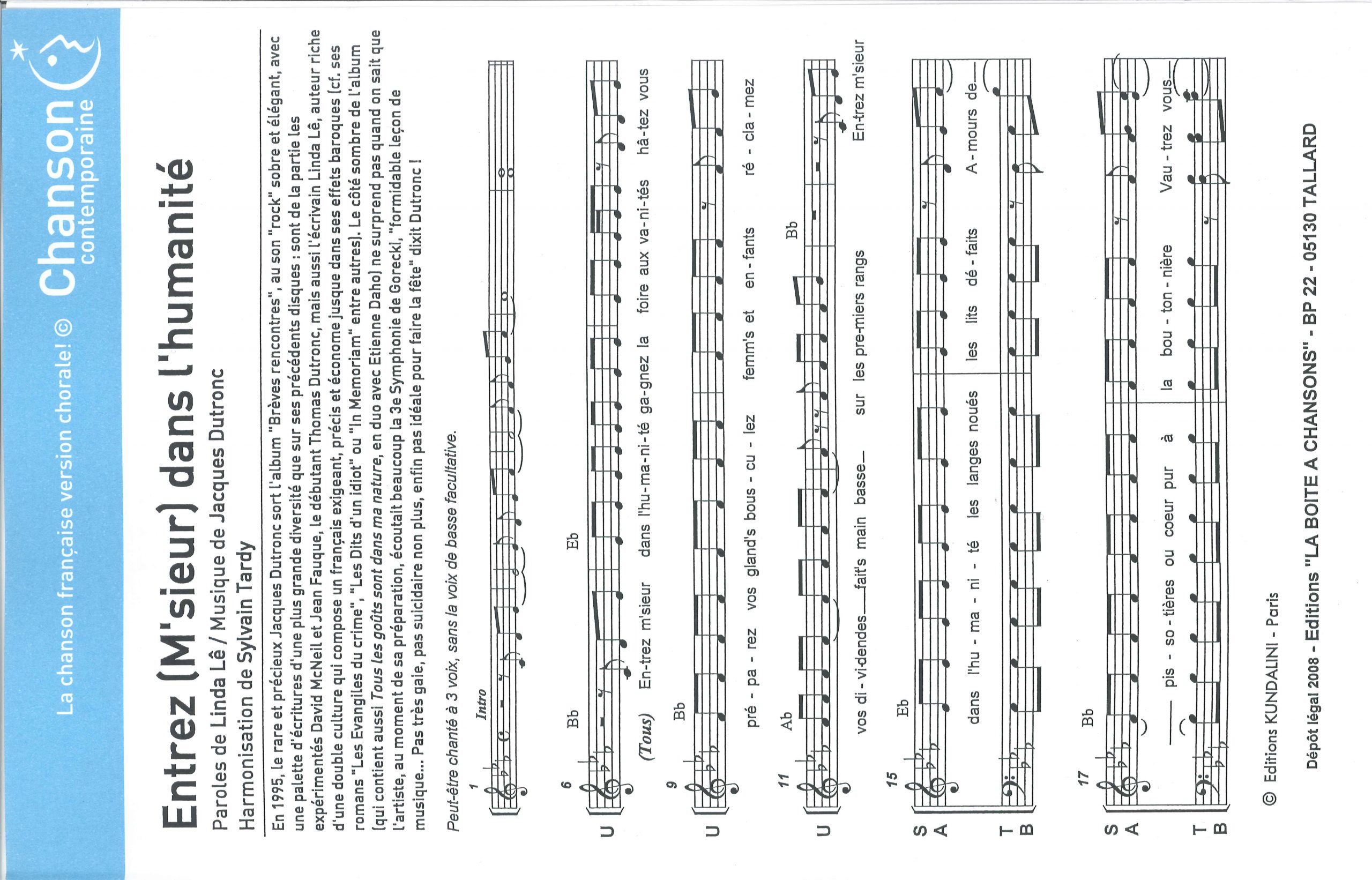 Paroles et musique de LE/DUTRONC Harmonisation : Sylvain TARDY