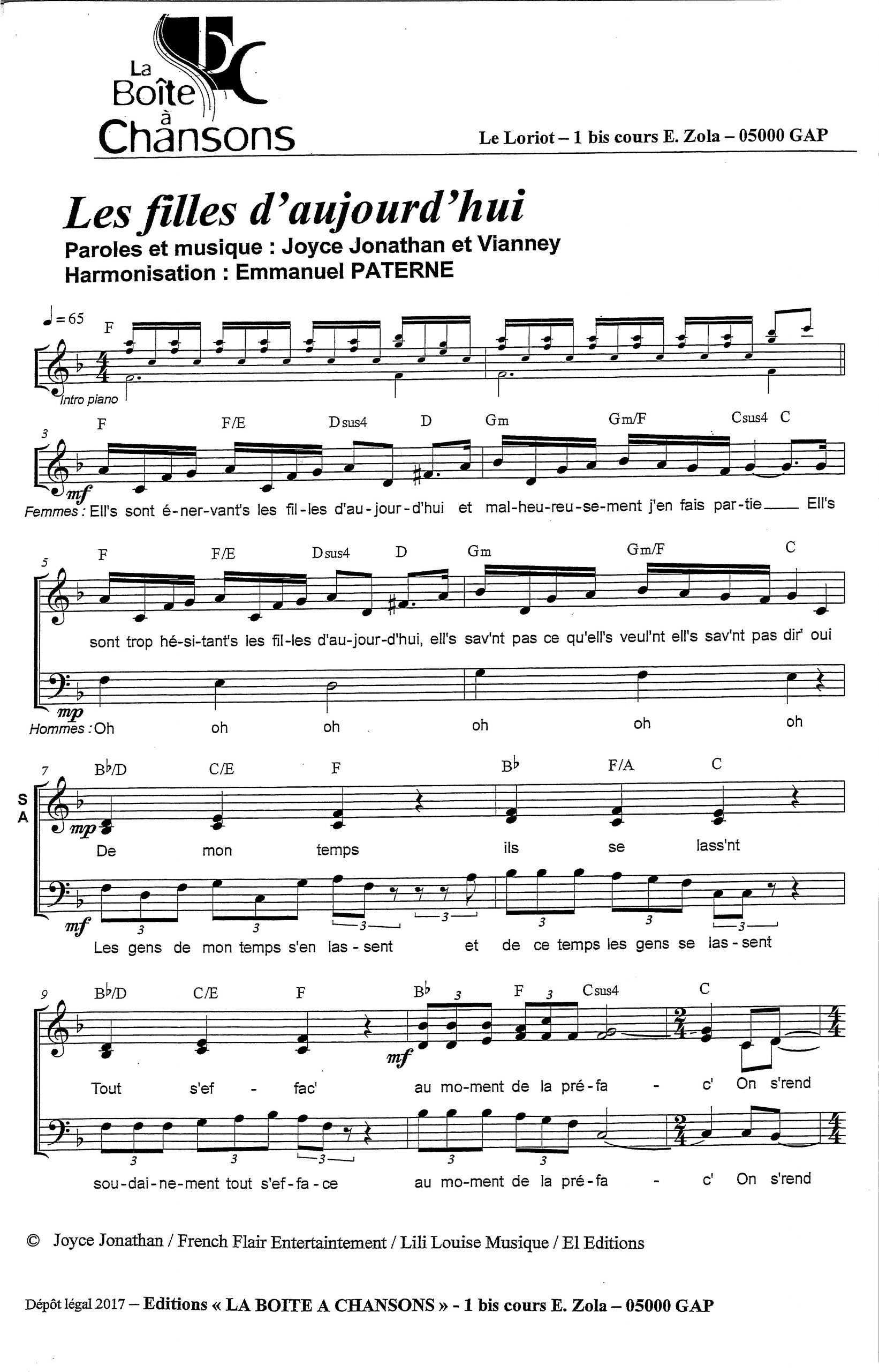Paroles et musique : J. Jonathan / Vianney Harmonisation : Emmanuel PATERNE