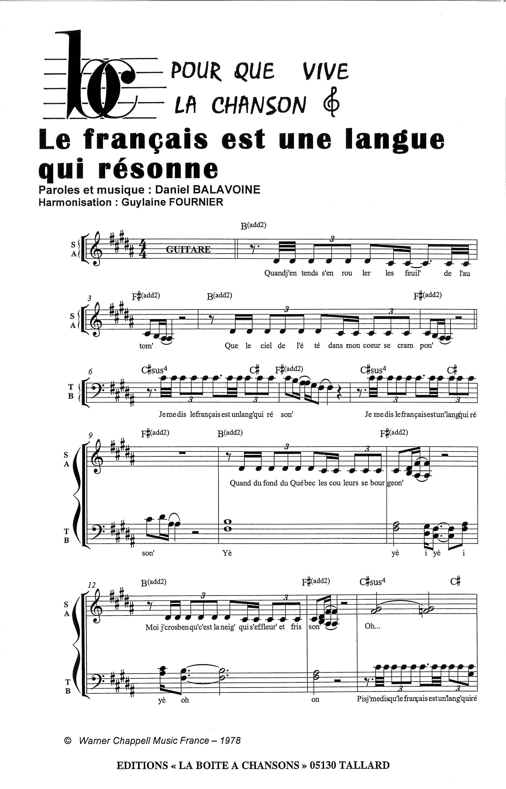 Paroles et musique de BALAVOINE Harmonisation : Guylaine FOURNIER
