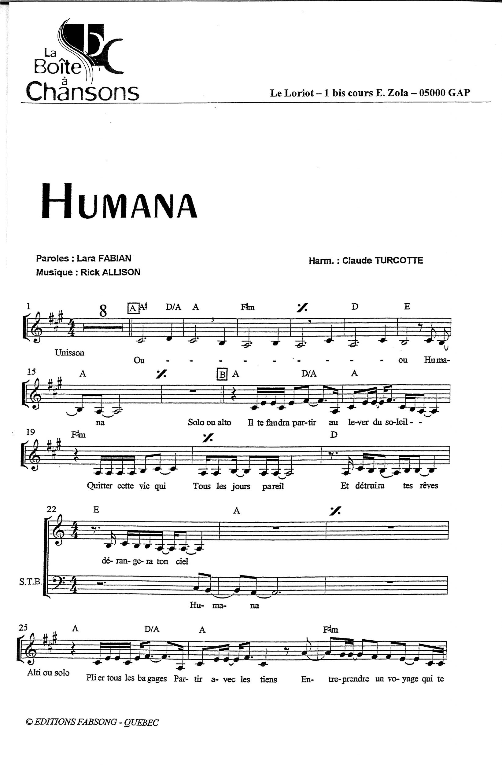 Paroles et musique de FABIAN/ALLISON Harmonisation : Claude TURCOTTE