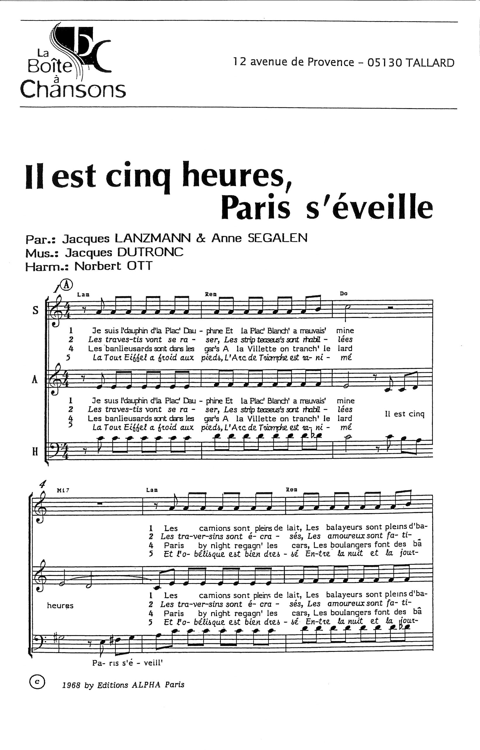 Paroles et musique de LANZMAN/SEGALEN/DUTRON Harmonisation : Norbert OTT