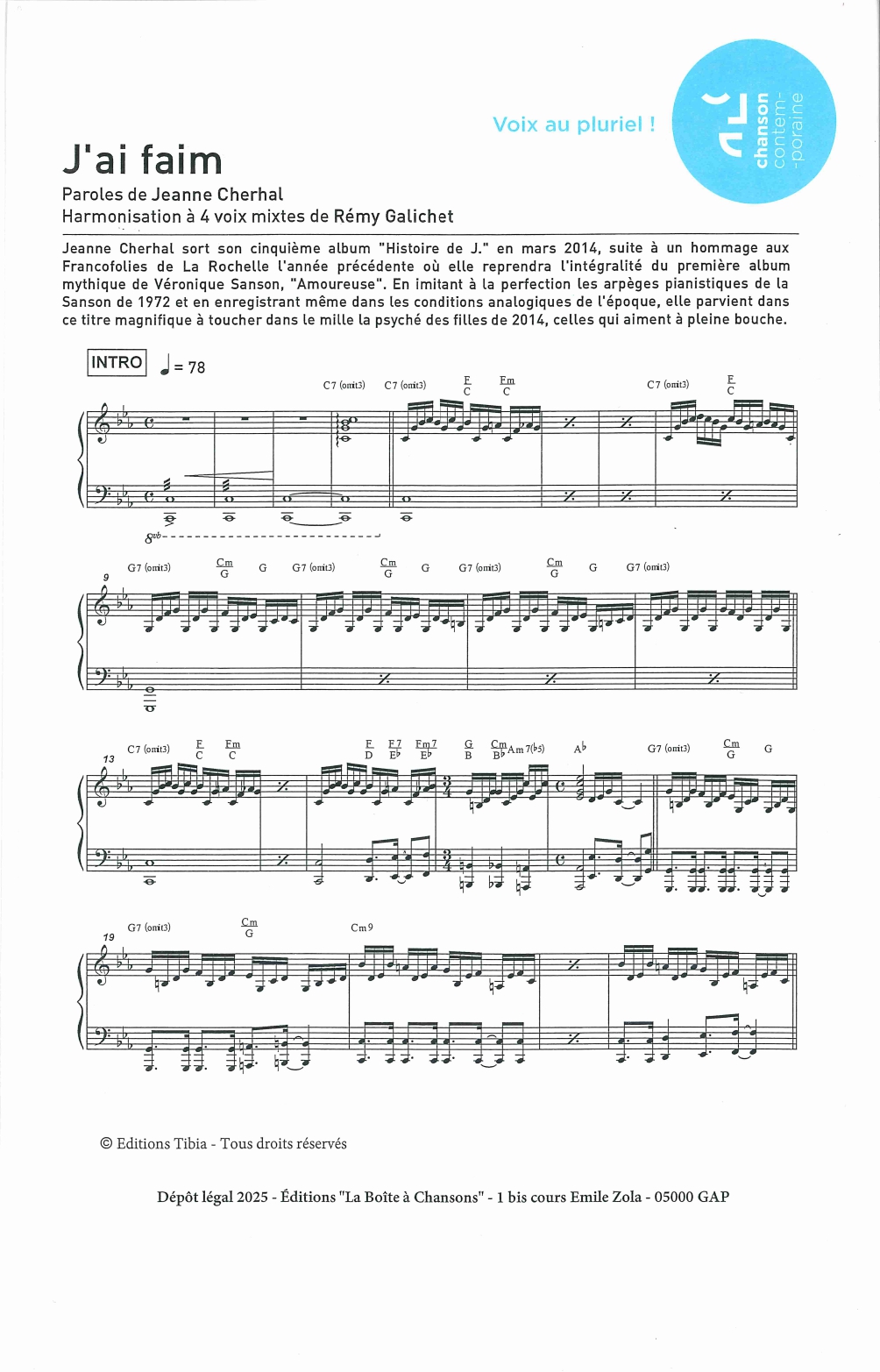 Paroles et musique : J Cherhal Harmonisation : Rémy GALICHET