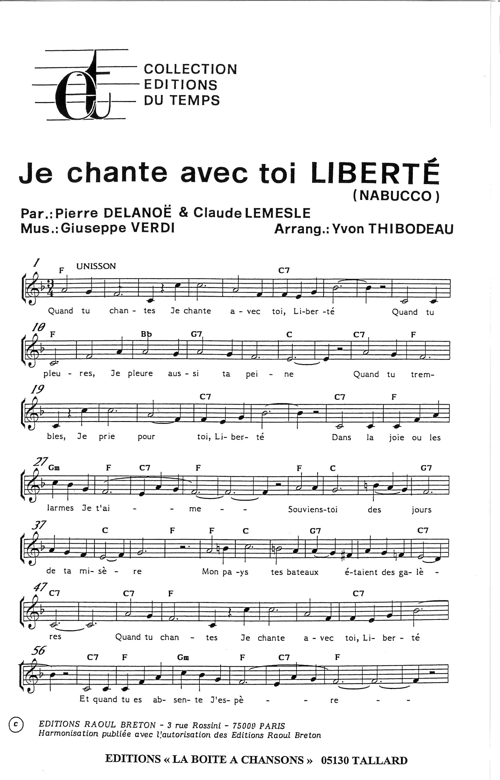 Paroles et musique : Delanoe / Verdi Harmonisation : Yvon THIBODEAU
