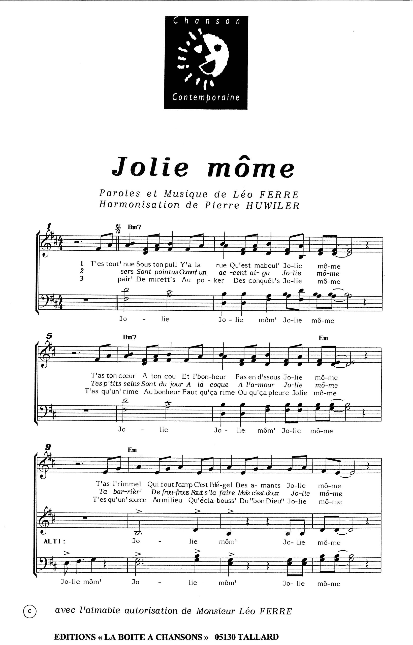 Paroles et musique de FERRE Harmonisation : Pierre HUWILER