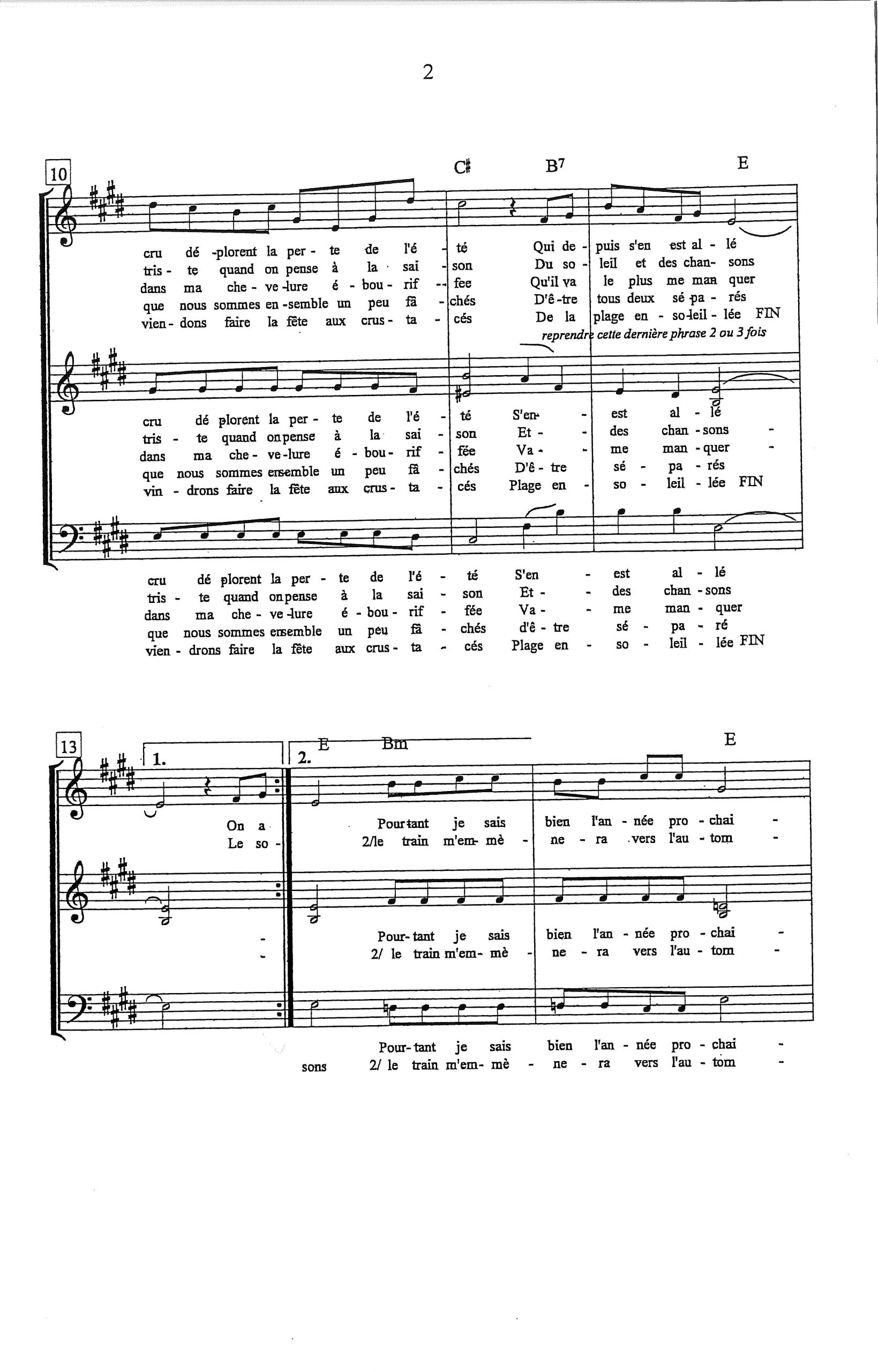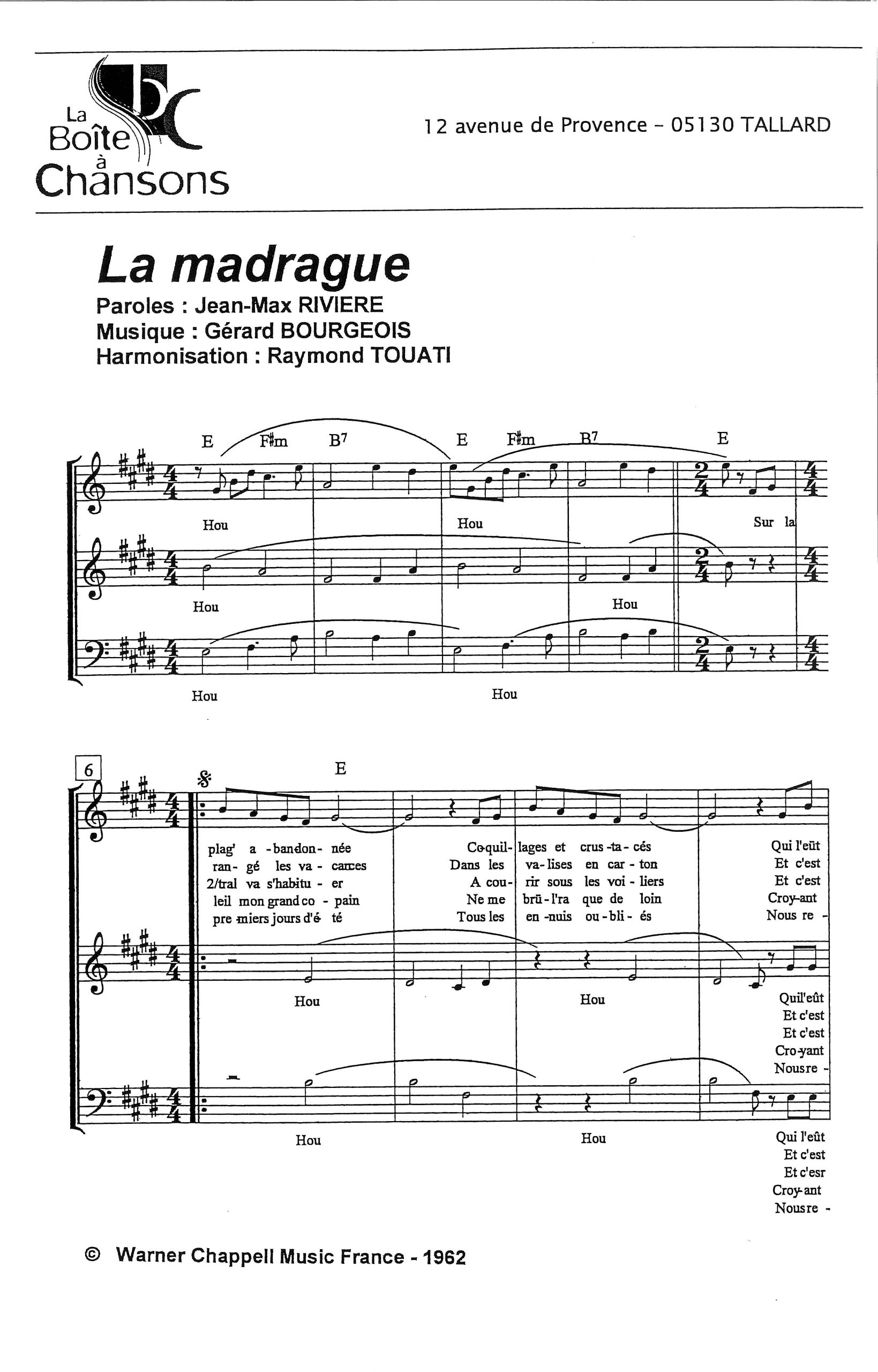 Paroles et musique de RIVIERE / BOURGEOIS Harmonisation : Raymond TOUATI