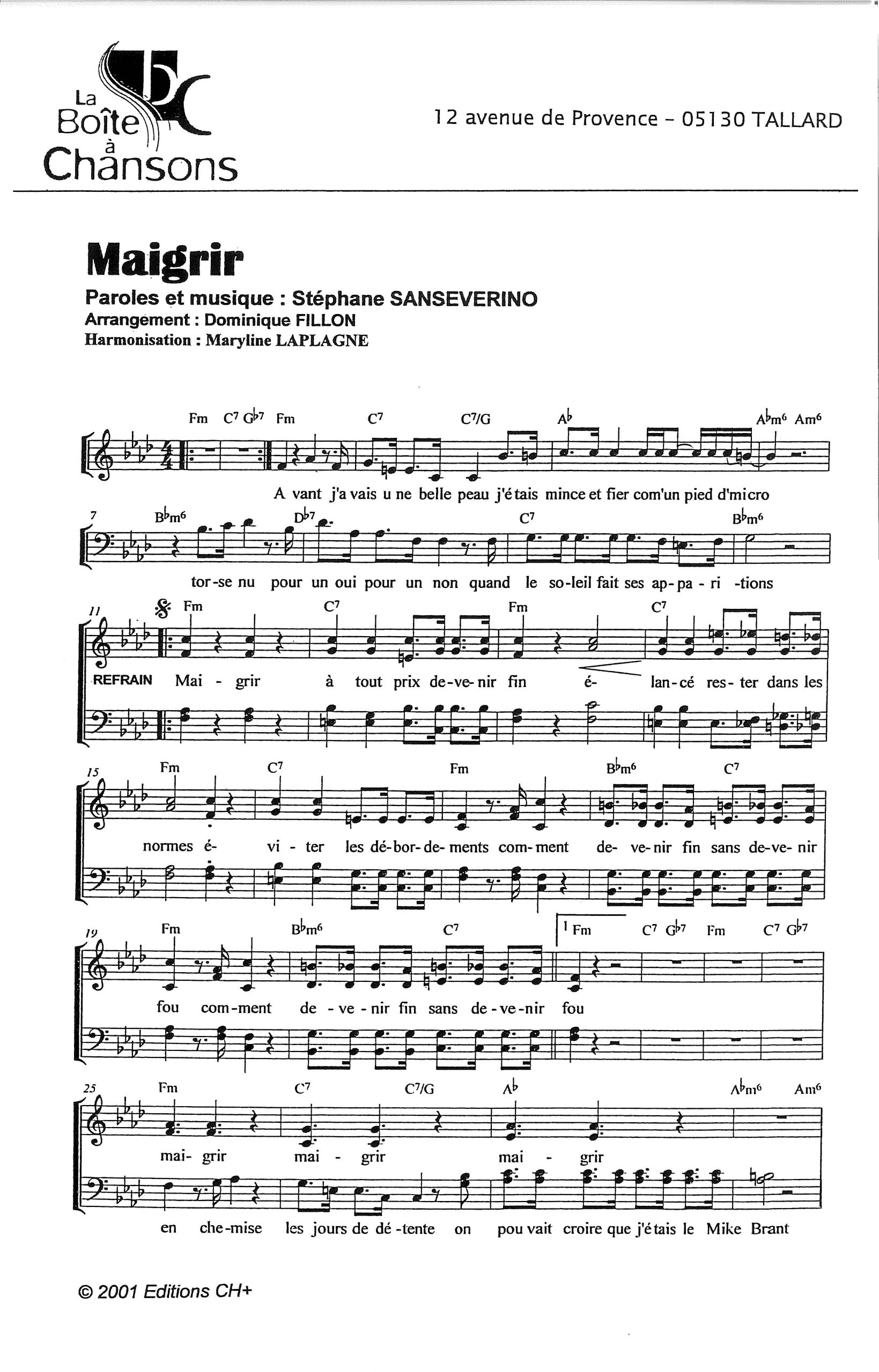 Paroles et musique de SANSEVERINO Harmonisation : Maryline LAPLAGNE