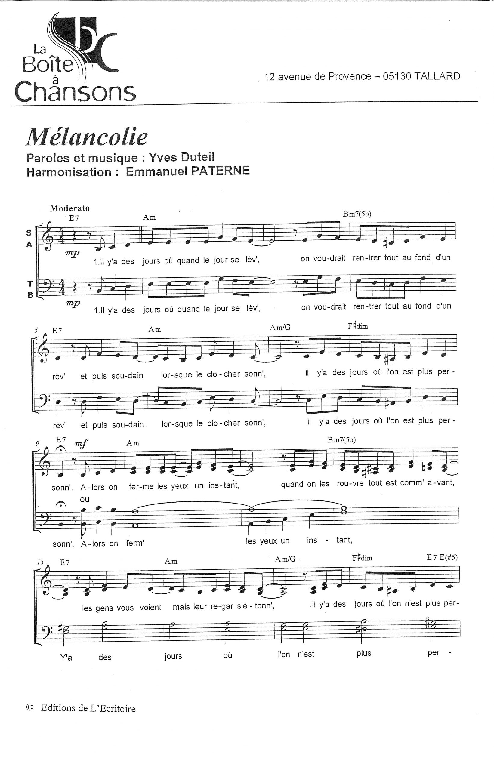 Paroles et musique : Y. Duteil Harmonisation : Emmanuel PATERNE