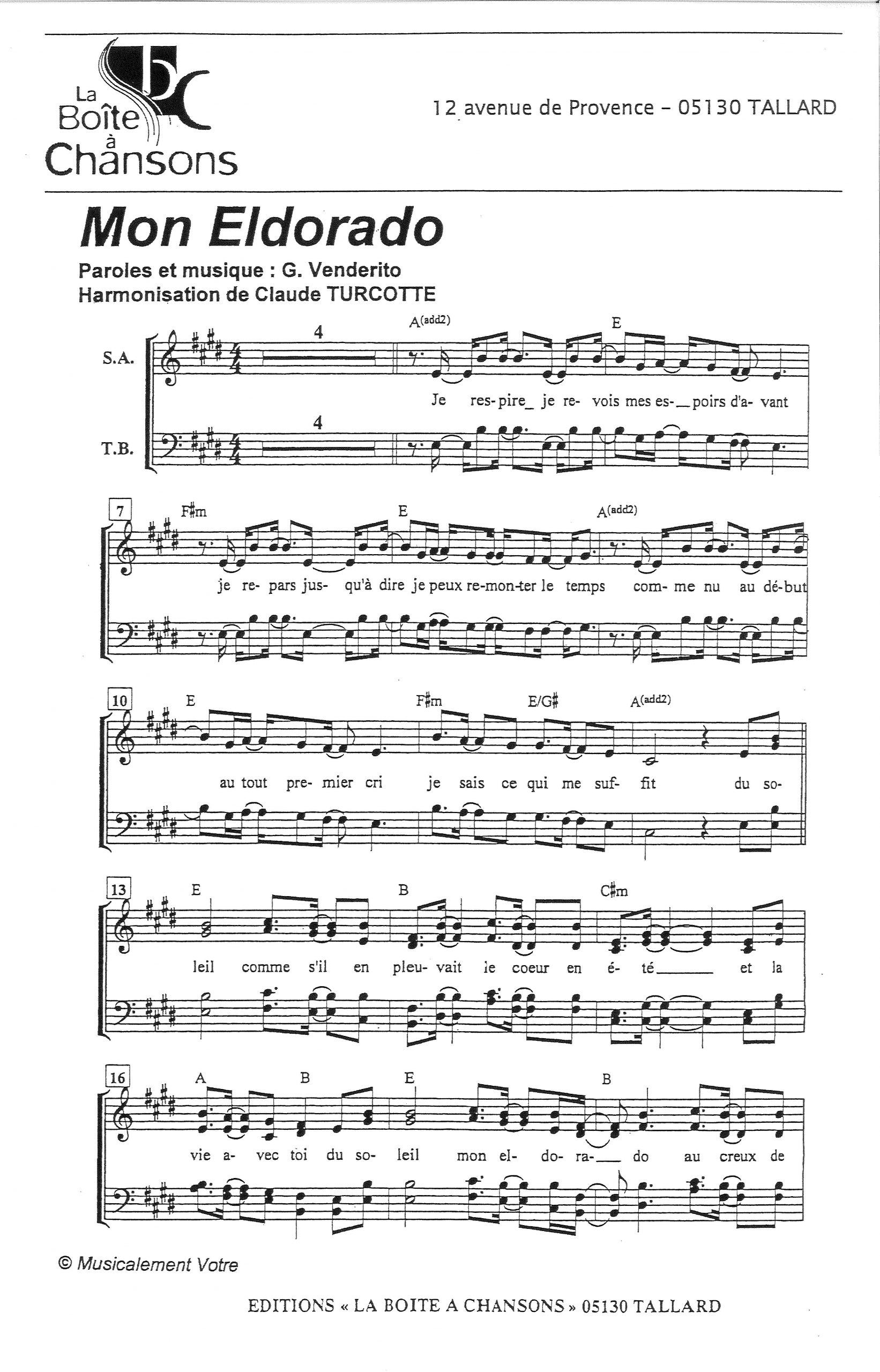 Paroles et musique de VENDERITO Harmonisation : Claude TURCOTTE