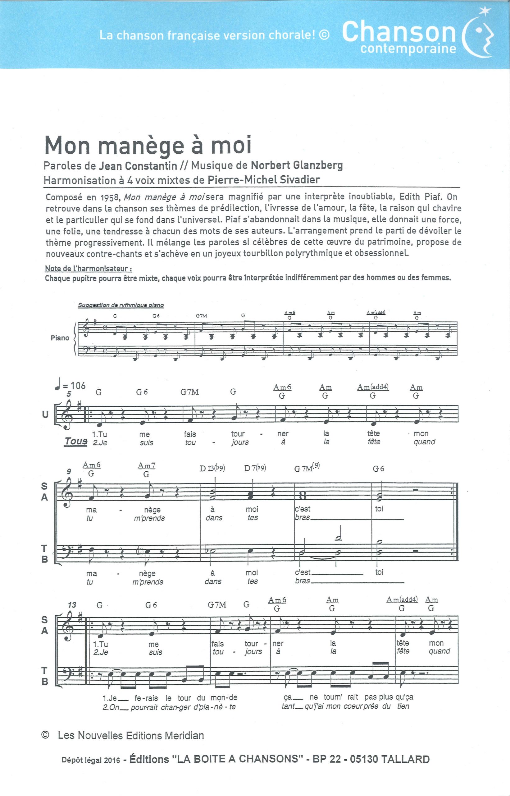 Paroles et musique : Constantin / Glanzberg Harmonisation : Pierre Michel SIVADIER