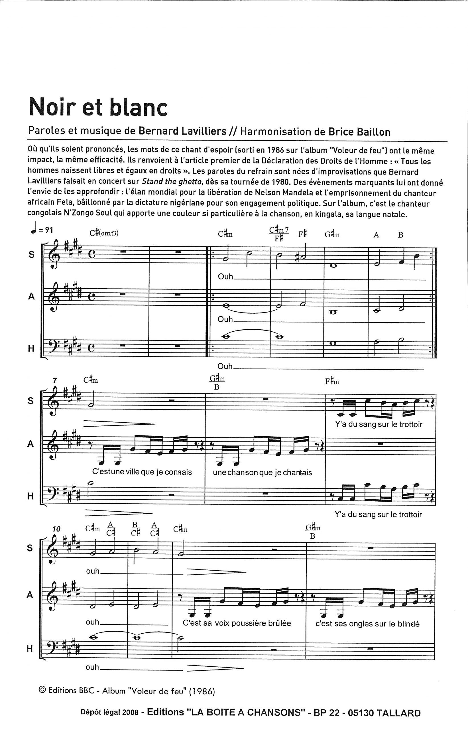 Paroles et musique de LAVILLIERS Harmonisation : Brice BAILLON