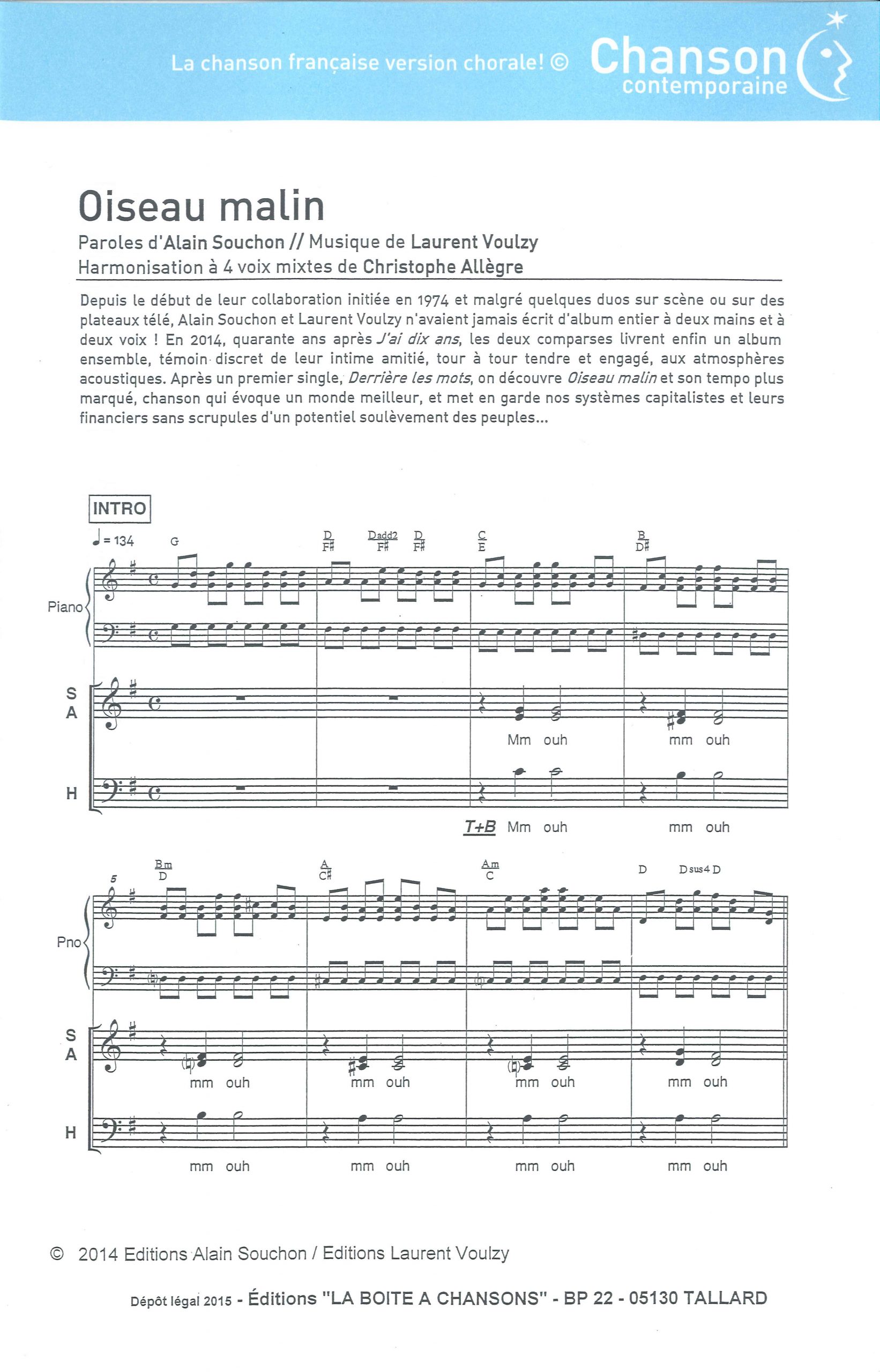 Paroles et musique : A. Bouchon / L. Voulzy Harmonisation : Christophe ALLEGRE