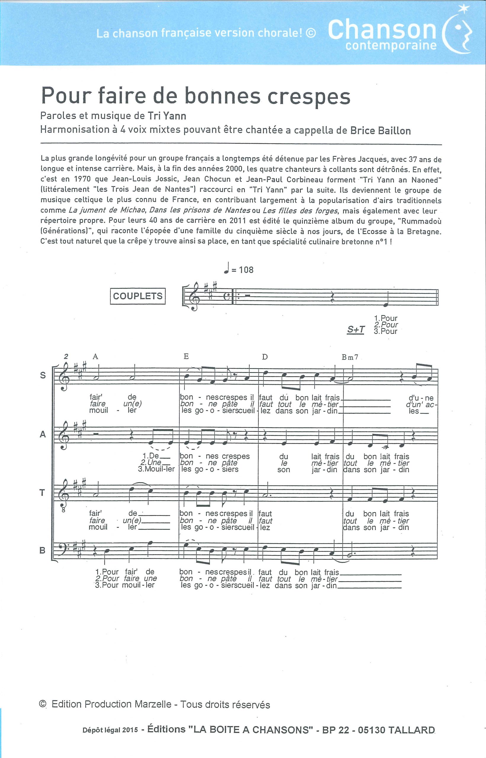 Paroles et musique : Tri Yann Harmonisation : Brice BAILLON