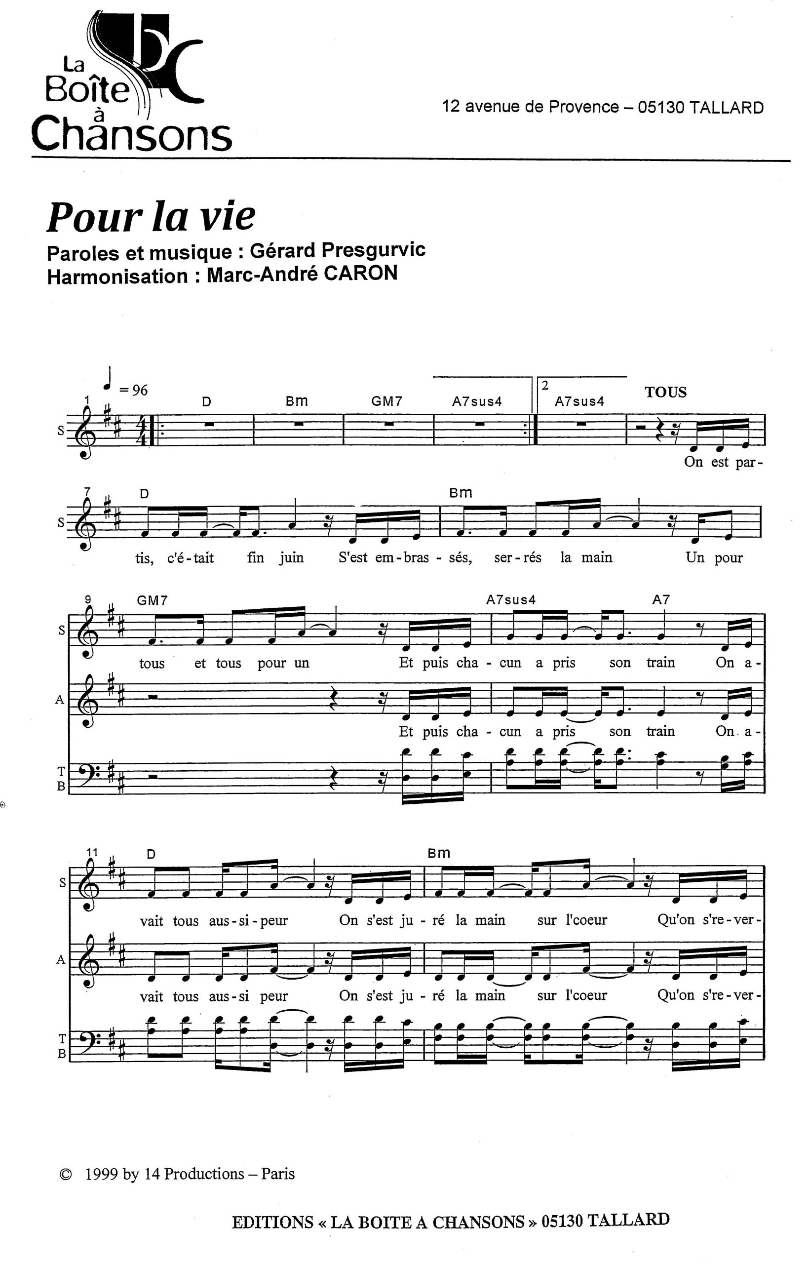 Paroles et musique de PRESGURVIC Harmonisation : Marc André CARON