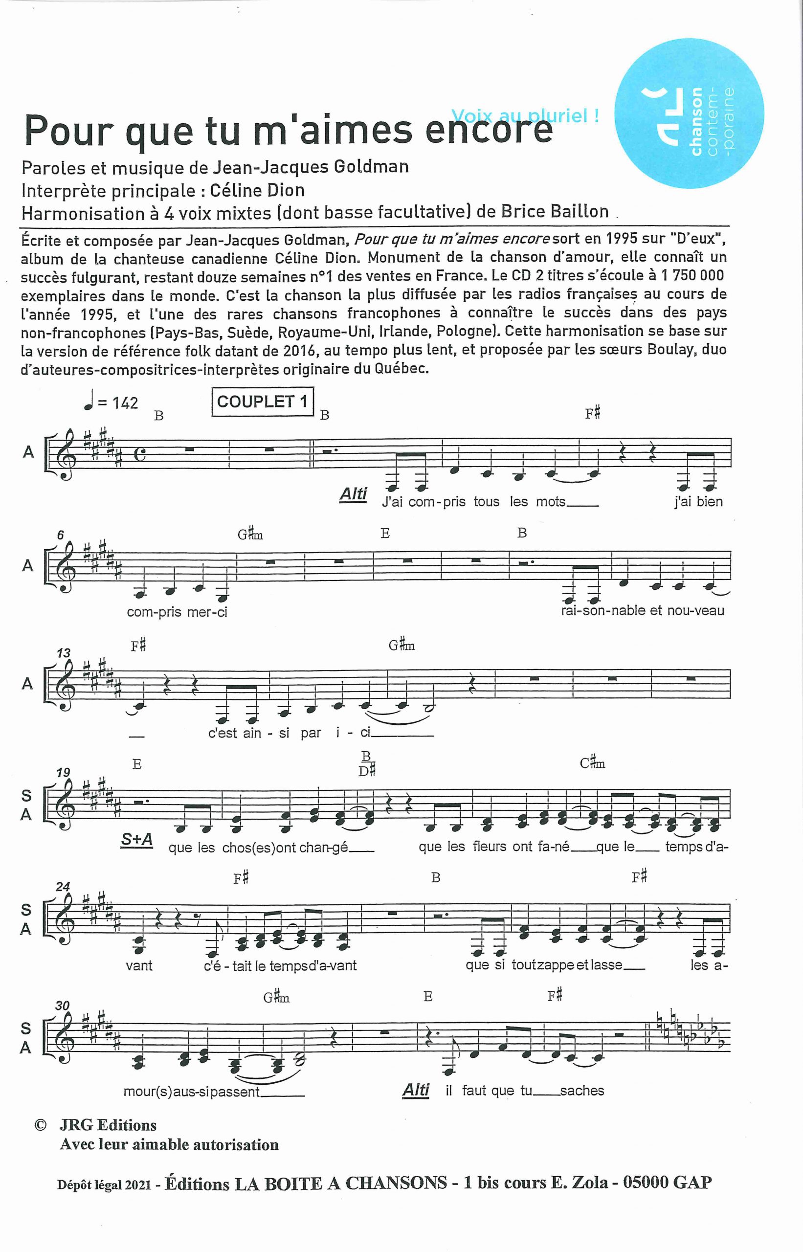 Paroles et musique : J.J. Goldman / C. Dion Harmonisation: Brice Baillon
