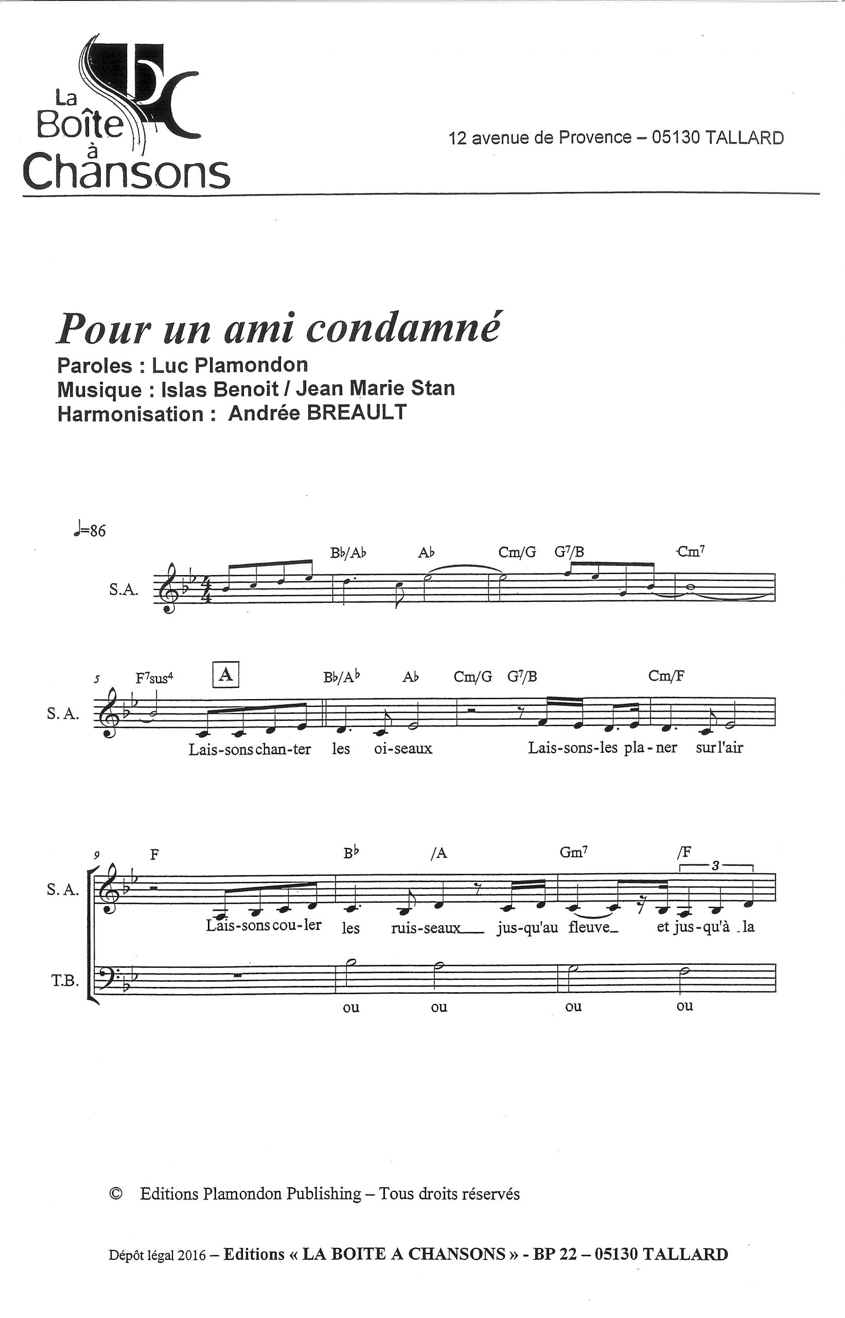 Paroles et musique : L. Plamondon / I. Benoit / JM Stan Harmonisation : Andrée BREAULT