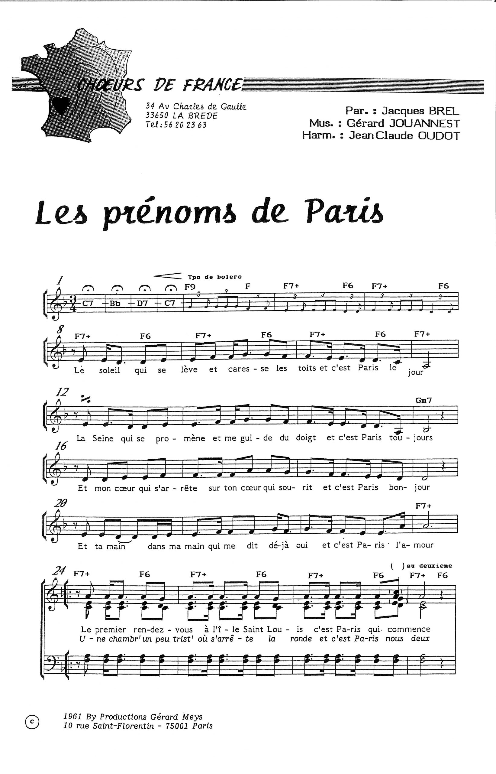 Paroles et musique de BREL/JOUANNEST Harmonisation : Jean Claude OUDOT