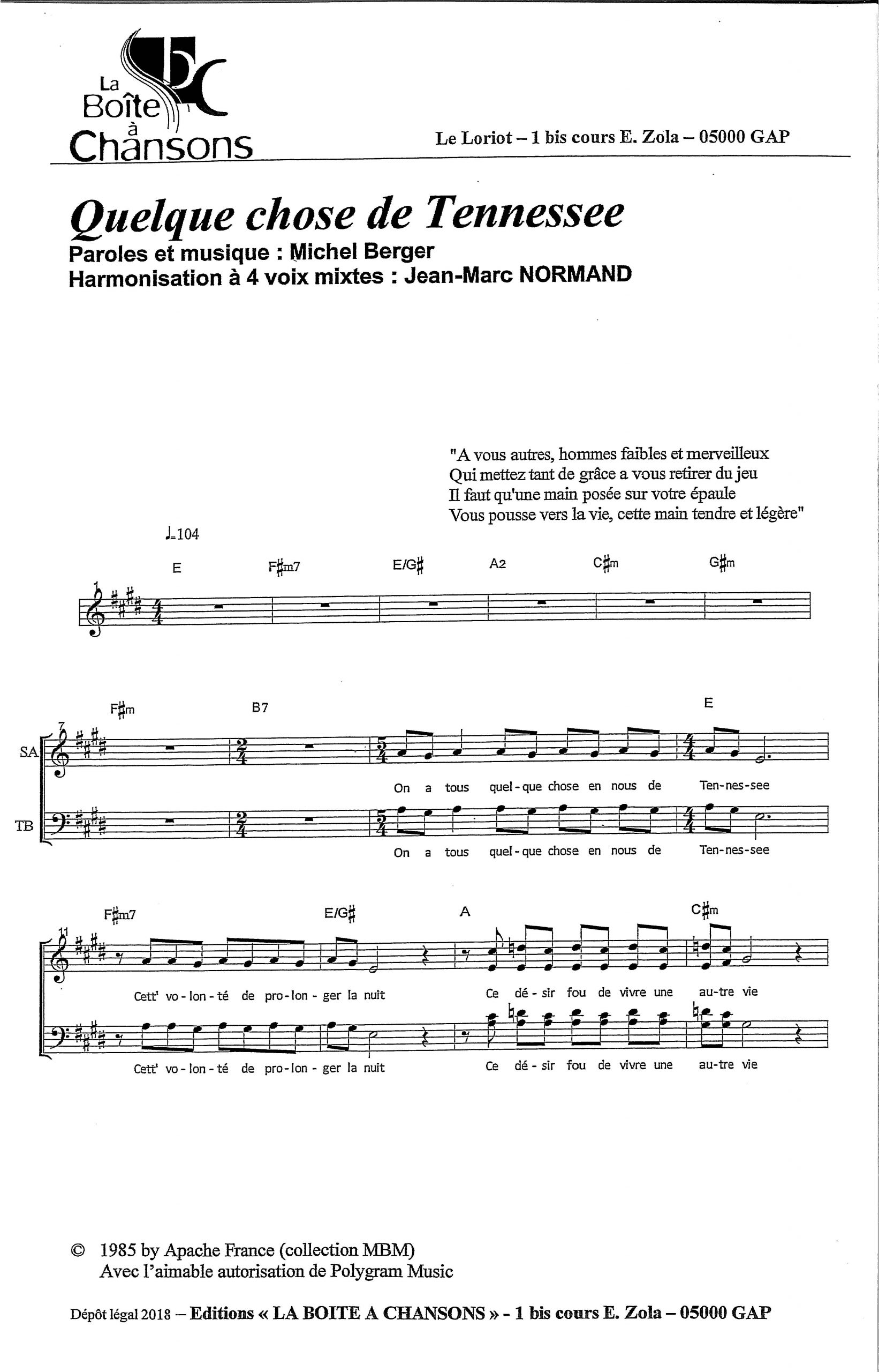 Paroles et musique : M. Berger Harmonisation : Jean Marc Normand