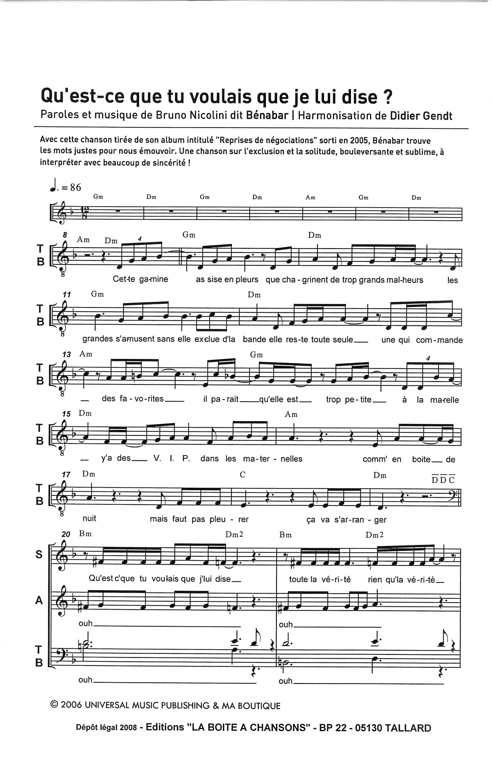 Paroles et musique de BENABAR Harmonisation : Didier GENDT