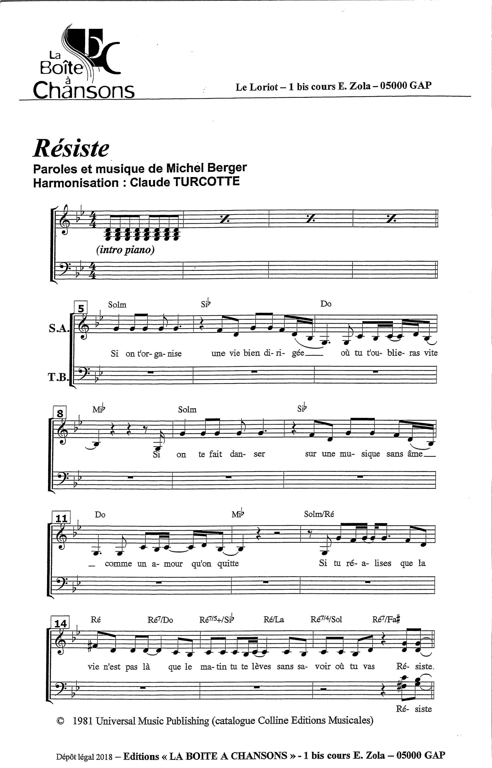Paroles et musique : M. Berger Harmonisation : Claude TURCOTTE