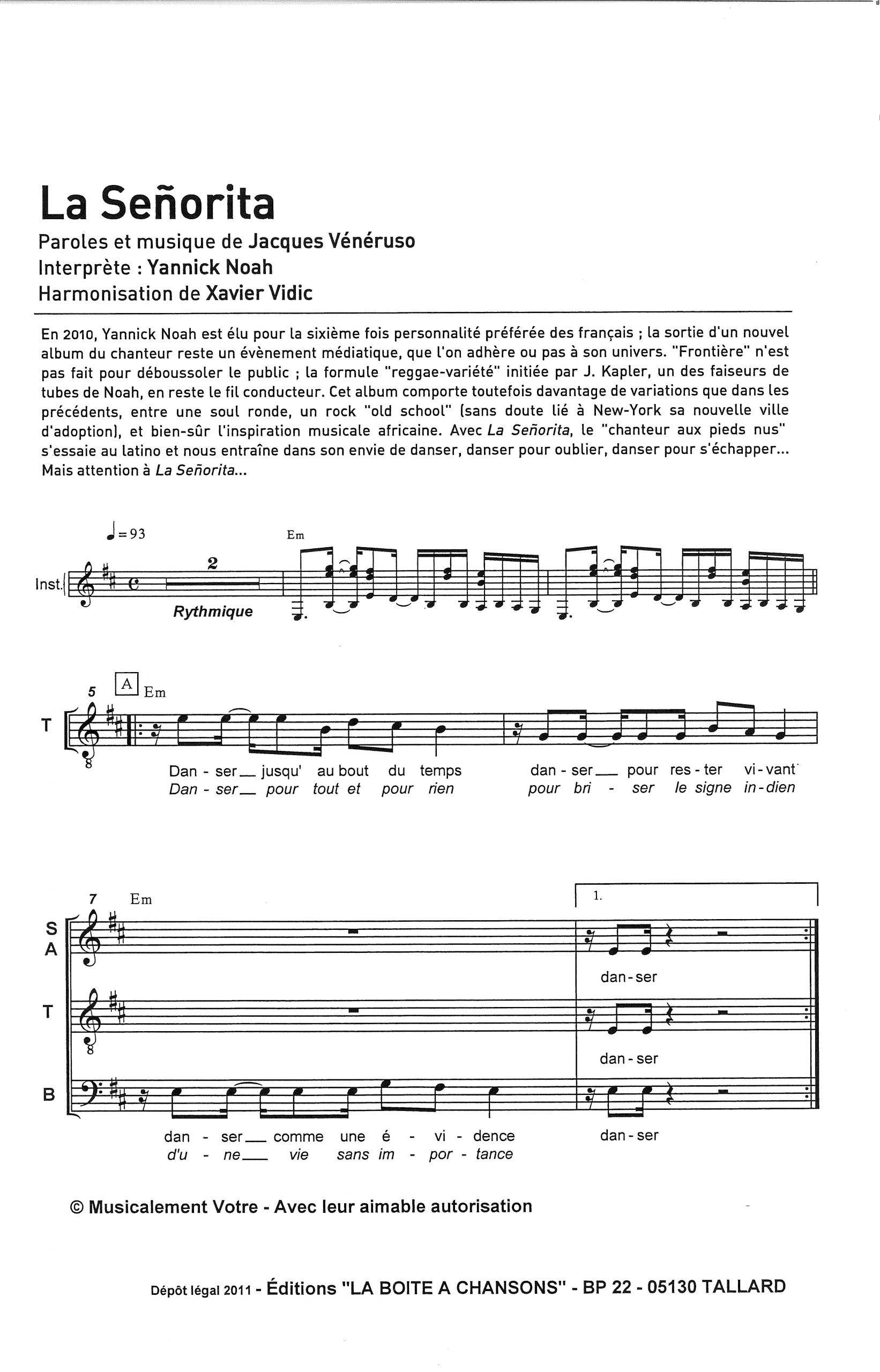 Paroles et musique de NOAH Harmonisation : Xavier VIDIC