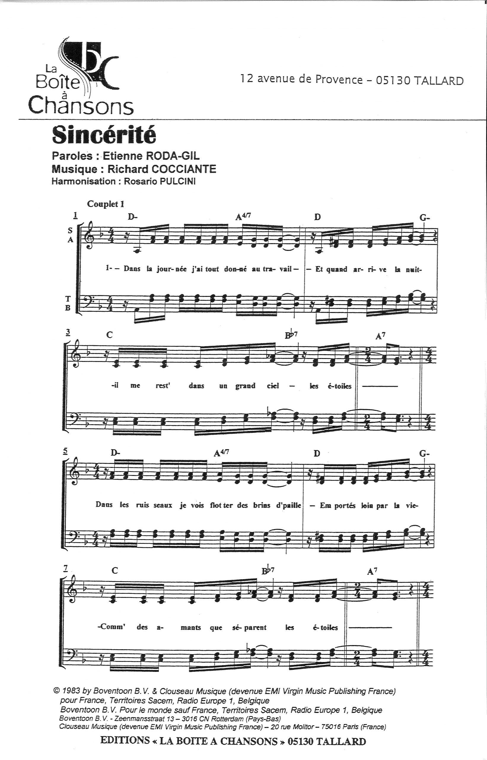 Paroles et musique de RODA-GIL/COCCIANTE Harmonisation : Rosario PULCINI
