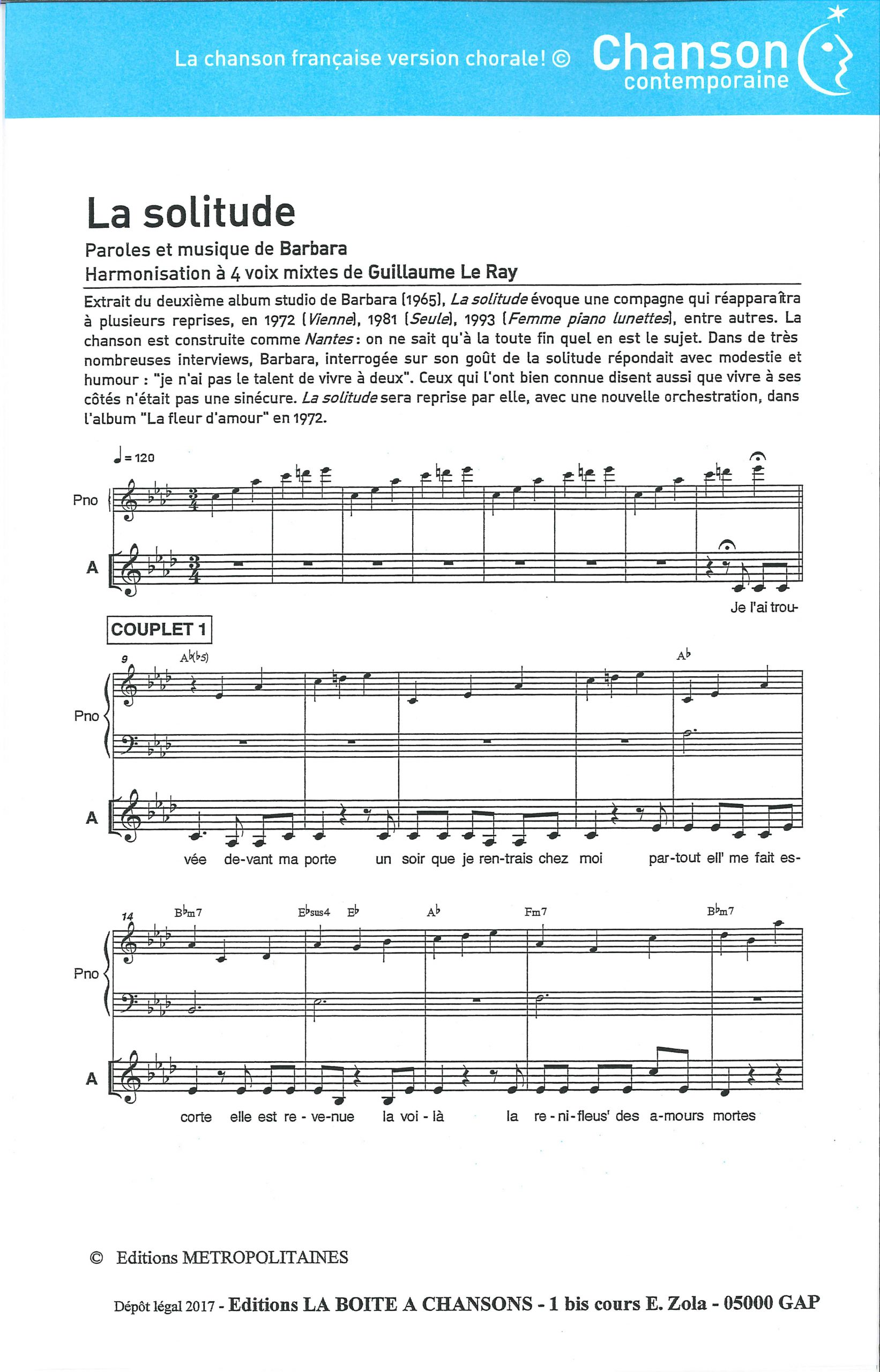 Paroles et musique : Barbara Harmonisation : Guillaume LE RAY