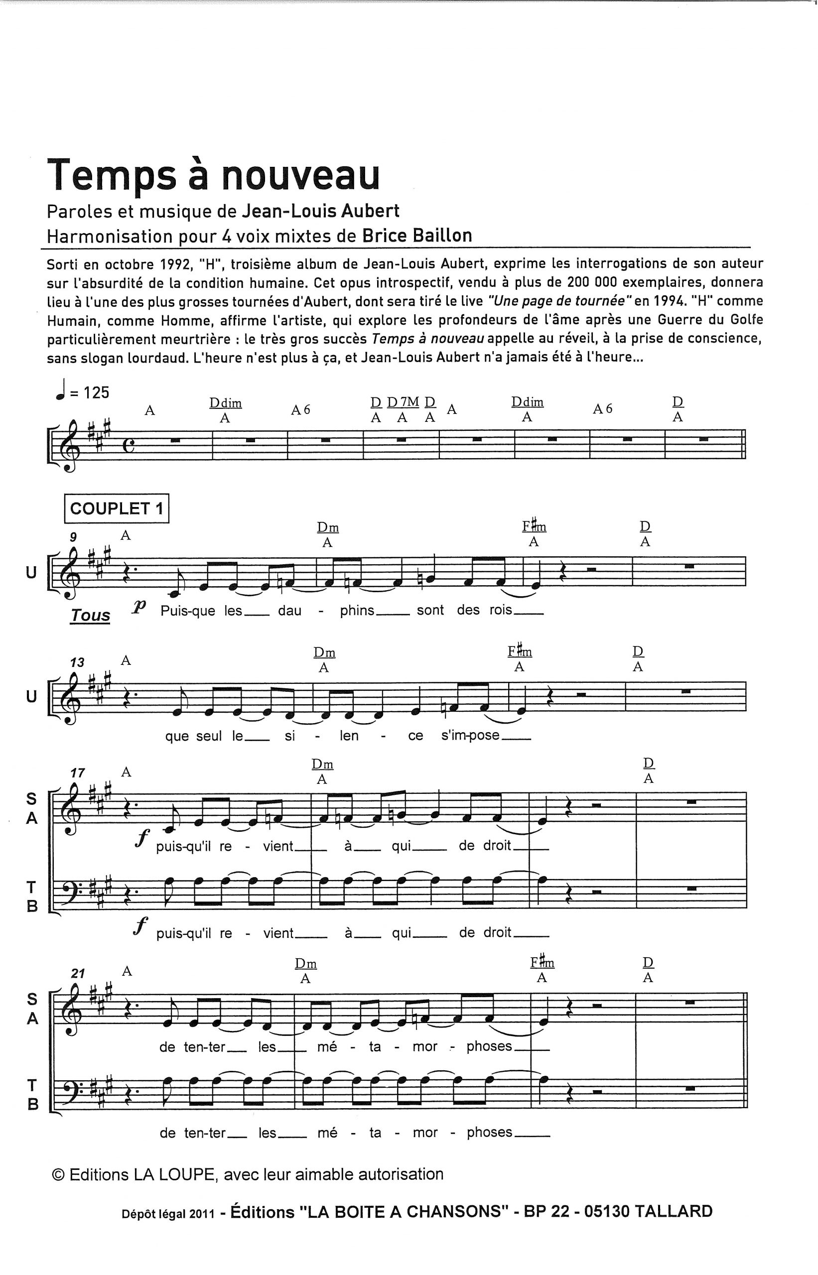 Paroles et musique de AUBERT Harmonisation : Brice BAILLON