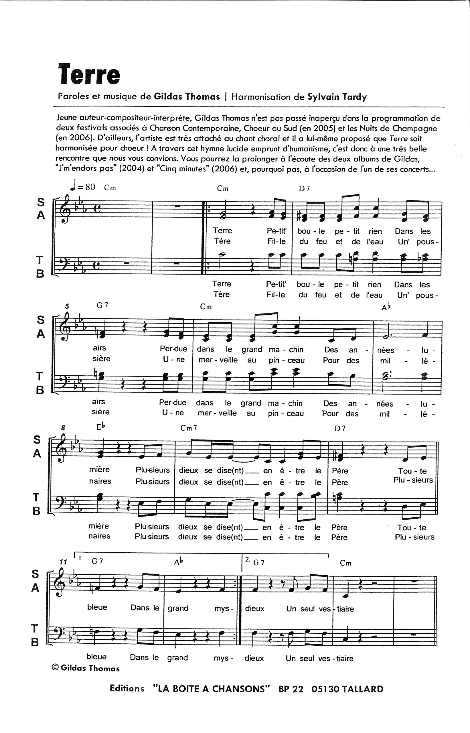Paroles et musique de THOMAS Harmonisation : Sylvain TARDY